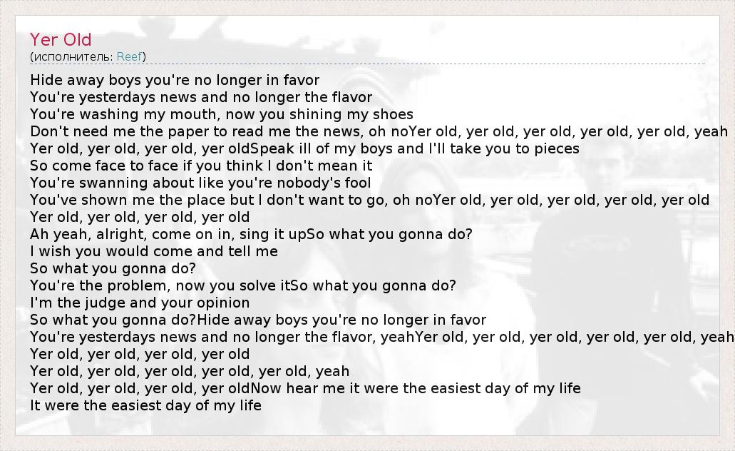 Hide away boys you're no longer in favor You're yesterdays news and no longer the flavor You're washing my mouth, now you shining my shoes Don't need me the paper to read me the news, oh noYer old, yer old, yer old, yer old, yer old, yeah Yer old, yer old, yer old, yer oldSpeak ill of my boys and I'll take you to pieces So come face to face if you think I don't mean it You're swanning about like you're nobody's fool You've shown me the place but I don't want to go, oh noYer old, yer old, yer old, yer old, yer old Yer old, yer old, yer old, yer old Ah yeah, alright, come on in, sing it upSo what you gonna do? I wish you would come and tell me So what you gonna do? You're the problem, now you solve itSo what you gonna do? I'm the judge and your opinion So what you gonna do?Hide away boys you're no longer in favor You're yesterdays news and no longer the flavor, yeahYer old, yer old, yer old, yer old, yer old, yeah Yer old, yer old, yer old, yer old Yer old, yer old, yer old, yer old, yer old, yeah Yer old, yer old, yer old, yer oldNow hear me it were the easiest day of my life It were the easiest day of my life