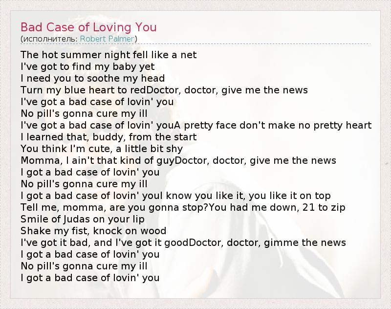 The hot summer night fell like a net I've got to find my baby yet I need you to soothe my head Turn my blue heart to redDoctor, doctor, give me the news I've got a bad case of lovin' you No pill's gonna cure my ill I've got a bad case of lovin' youA pretty face don't make no pretty heart I learned that, buddy, from the start You think I'm cute, a little bit shy Momma, I ain't that kind of guyDoctor, doctor, give me the news I got a bad case of lovin' you No pill's gonna cure my ill I got a bad case of lovin' youI know you like it, you like it on top Tell me, momma, are you gonna stop?You had me down, 21 to zip Smile of Judas on your lip Shake my fist, knock on wood I've got it bad, and I've got it goodDoctor, doctor, gimme the news I got a bad case of lovin' you No pill's gonna cure my ill I got a bad case of lovin' you