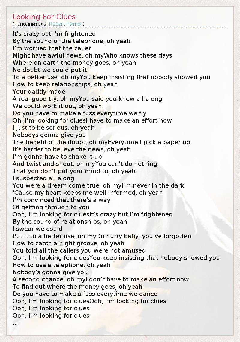 It's crazy but I'm frightened By the sound of the telephone, oh yeah I'm worried that the caller Might have awful news, oh myWho knows these days Where on earth the money goes, oh yeah No doubt we could put it To a better use, oh myYou keep insisting that nobody showed you How to keep relationships, oh yeah Your daddy made A real good try, oh myYou said you knew all along We could work it out, oh yeah Do you have to make a fuss everytime we fly Oh, I'm looking for cluesI have to make an effort now I just to be serious, oh yeah Nobodys gonna give you The benefit of the doubt, oh myEverytime I pick a paper up It's harder to believe the news, oh yeah I'm gonna have to shake it up And twist and shout, oh myYou can't do nothing That you don't put your mind to, oh yeah I suspected all along You were a dream come true, oh myI'm never in the dark 'Cause my heart keeps me well informed, oh yeah I'm convinced that there's a way Of getting through to you Ooh, I'm looking for cluesIt's crazy but I'm frightened By the sound of relationships, oh yeah I swear we could Put it to a better use, oh myDo hurry baby, you've forgotten How to catch a night groove, oh yeah You told all the callers you were not amused Ooh, I'm looking for cluesYou keep insisting that nobody showed you How to use a telephone, oh yeah Nobody's gonna give you A second chance, oh myI don't have to make an effort now To find out where the money goes, oh yeah Do you have to make a fuss everytime we dance Ooh, I'm looking for cluesOoh, I'm looking for clues Ooh, I'm looking for clues Ooh, I'm looking for clues ...