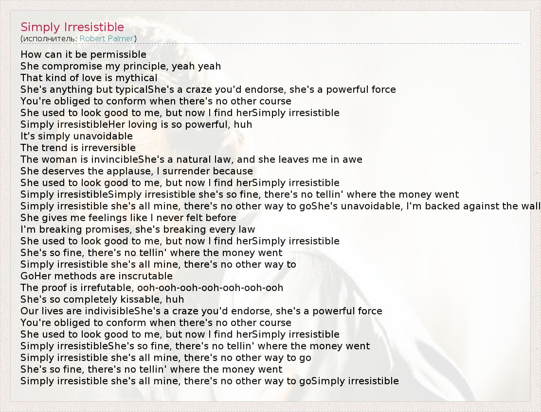 А как ты думаешь, о чем песня "Simply Irresistible" ?
