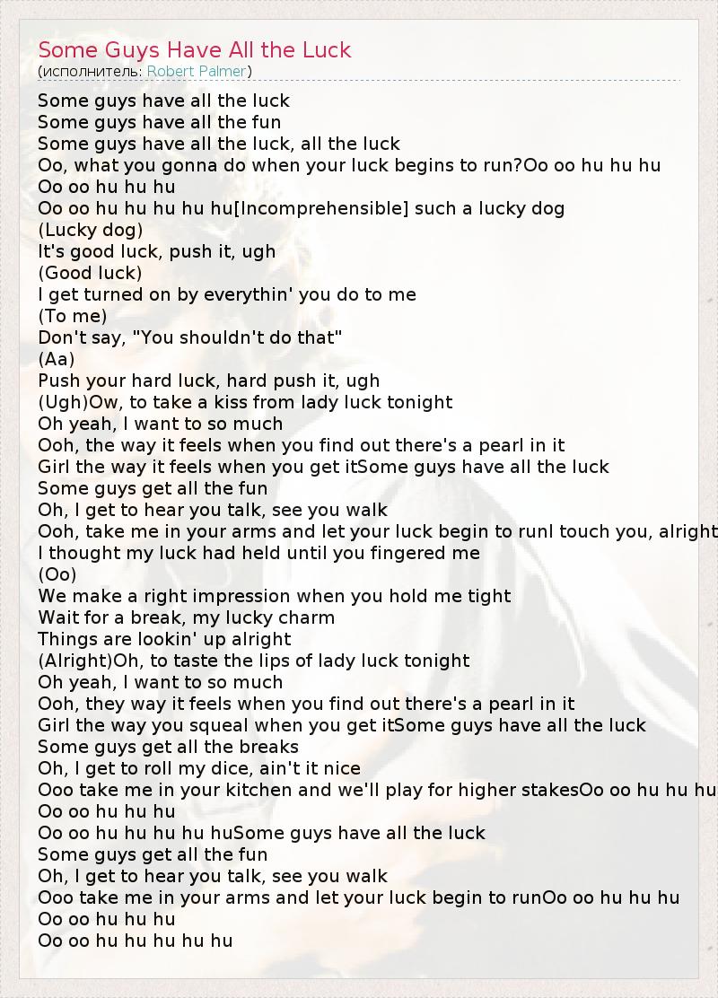 Some guys have all the luck Some guys have all the fun Some guys have all the luck, all the luck Oo, what you gonna do when your luck begins to run?Oo oo hu hu hu Oo oo hu hu hu Oo oo hu hu hu hu hu[Incomprehensible] such a lucky dog (Lucky dog) It's good luck, push it, ugh (Good luck) I get turned on by everythin' you do to me (To me) Don't say, "You shouldn't do that" (Aa) Push your hard luck, hard push it, ugh (Ugh)Ow, to take a kiss from lady luck tonight Oh yeah, I want to so much Ooh, the way it feels when you find out there's a pearl in it Girl the way it feels when you get itSome guys have all the luck Some guys get all the fun Oh, I get to hear you talk, see you walk Ooh, take me in your arms and let your luck begin to runI touch you, alright I thought my luck had held until you fingered me (Oo) We make a right impression when you hold me tight Wait for a break, my lucky charm Things are lookin' up alright (Alright)Oh, to taste the lips of lady luck tonight Oh yeah, I want to so much Ooh, they way it feels when you find out there's a pearl in it Girl the way you squeal when you get itSome guys have all the luck Some guys get all the breaks Oh, I get to roll my dice, ain't it nice Ooo take me in your kitchen and we'll play for higher stakesOo oo hu hu hu Oo oo hu hu hu Oo oo hu hu hu hu huSome guys have all the luck Some guys get all the fun Oh, I get to hear you talk, see you walk Ooo take me in your arms and let your luck begin to runOo oo hu hu hu Oo oo hu hu hu Oo oo hu hu hu hu hu