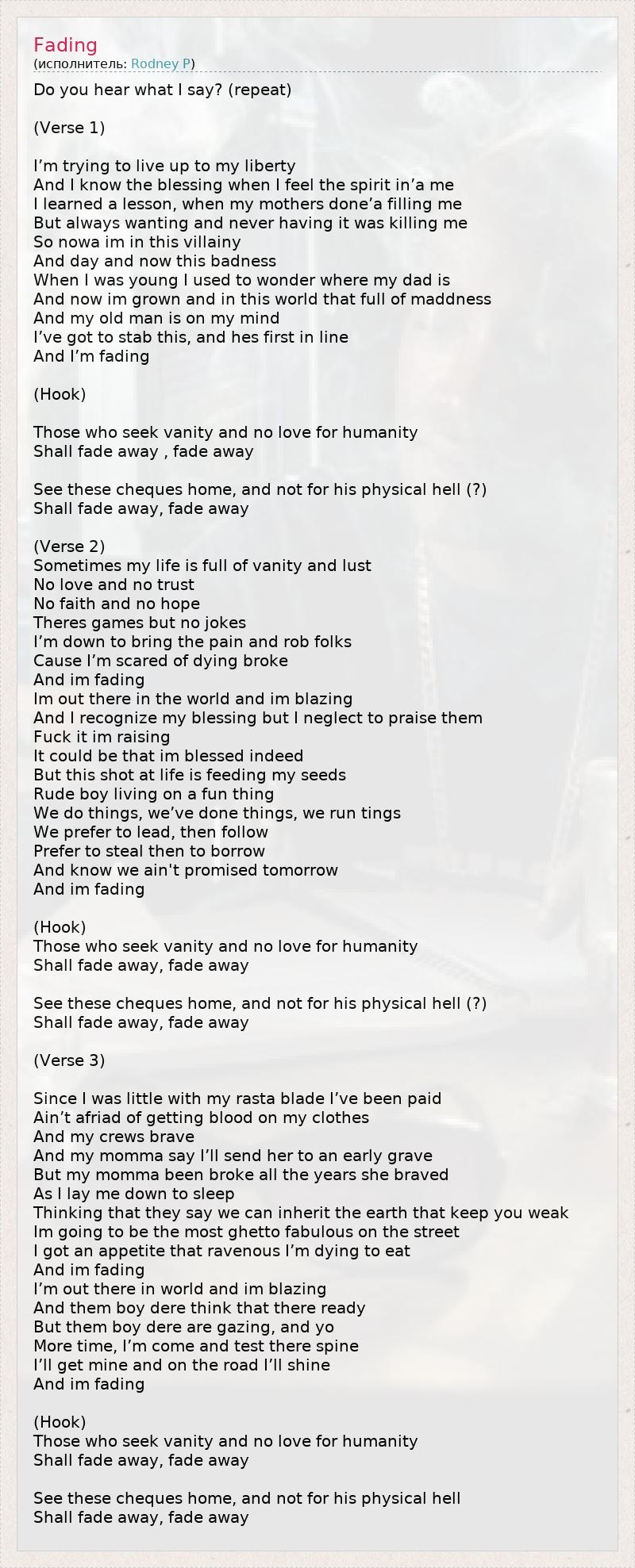 Do you hear what I say? (repeat) (Verse 1) I’m trying to live up to my liberty And I know the blessing when I feel the spirit in’a me I learned a lesson, when my mothers done’a filling me But always wanting and never having it was killing me So nowa im in this villainy And day and now this badness When I was young I used to wonder where my dad is And now im grown and in this world that full of maddness And my old man is on my mind I’ve got to stab this, and hes first in line And I’m fading (Hook) Those who seek vanity and no love for humanity Shall fade away , fade away See these cheques home, and not for his physical hell (?) Shall fade away, fade away (Verse 2) Sometimes my life is full of vanity and lust No love and no trust No faith and no hope Theres games but no jokes I’m down to bring the pain and rob folks Cause I’m scared of dying broke And im fading Im out there in the world and im blazing And I recognize my blessing but I neglect to praise them Fuck it im raising It could be that im blessed indeed But this shot at life is feeding my seeds Rude boy living on a fun thing We do things, we’ve done things, we run tings We prefer to lead, then follow Prefer to steal then to borrow And know we ain't promised tomorrow And im fading (Hook) Those who seek vanity and no love for humanity Shall fade away, fade away See these cheques home, and not for his physical hell (?) Shall fade away, fade away (Verse 3) Since I was little with my rasta blade I’ve been paid Ain’t afriad of getting blood on my clothes And my crews brave And my momma say I’ll send her to an early grave But my momma been broke all the years she braved As I lay me down to sleep Thinking that they say we can inherit the earth that keep you weak Im going to be the most ghetto fabulous on the street I got an appetite that ravenous I’m dying to eat And im fading I’m out there in world and im blazing And them boy dere think that there ready But them boy dere are gazing, and yo More time, I’m come and test there spine I’ll get mine and on the road I’ll shine And im fading (Hook) Those who seek vanity and no love for humanity Shall fade away, fade away See these cheques home, and not for his physical hell Shall fade away, fade away