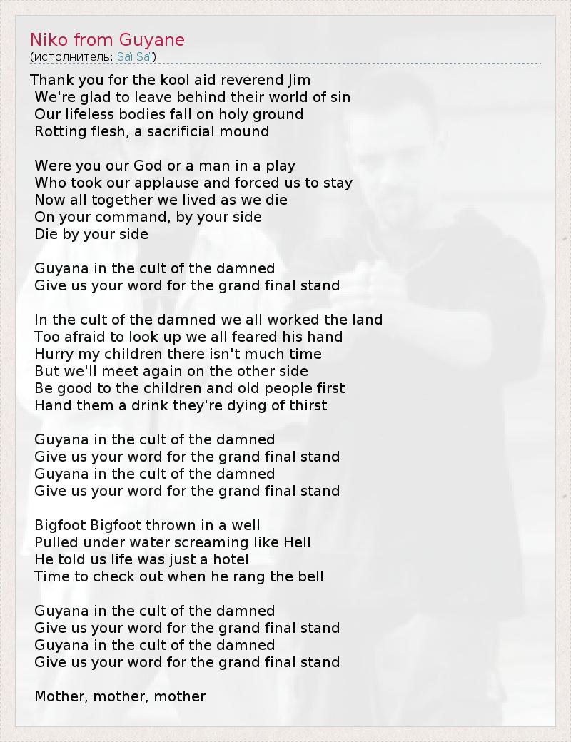 "Гайяна – культ проклятых" Спасибо тебе за твою своевременную помощь Преподобный Джим Мы рады покинуть свой порочный мир Наши безжизненные тела падают на священную землю Гниющая плоть, курган жертв Ты был нашим Богом или человеком в бою Тем, кто принял наше восхищение и заставил нас выстоять Теперь, также как мы жили все вместе, мы умерли По твоему приказу, рядом с тобой Гайяна в Культе Проклятых Дает нам твое обещание последней, грандиозной остановки В Культе Проклятых Мы все работали на страну, слишком боялись поднять глаза Мы все боялись его руки Поторопитесь, дети мои Осталось мало времени Но мы встретимся снова, на другой стороне Будем добры с детьми и стариками Первая рука поит их Они умирают от жажды Гайяна в Культе Проклятых Дает нам твое обещание последней, грандиозной остановки Большая нога, большая нога брошена в колодец Утащена под воду Неистовые вопли Он сказал нам, что жизнь была всего лишь отелем Пришло время проверить, когда он позвонил в колокол Гайяна в Культе Проклятых Дает нам твое обещание последней, грандиозной остановки Мама, мама