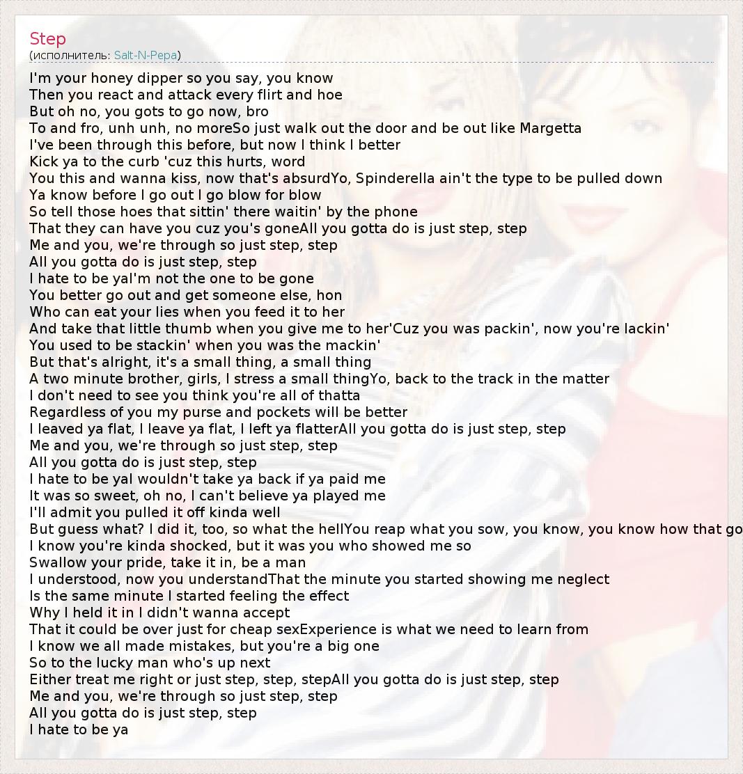 Это интересно:Напомню сразу, что SALT’N’PEPA — это женское трио из Америки.Cheryl ‘Salt’ James родом из нью–йоркского района Бруклин. Sandy‘Pepa’ Denton (р. 9.10.1969 г.) родилась на Ямайке, но росла также в Нью–Йорке (район Куинс). Обе семьи были многодетными.Дамочки познакомились в колледже, затем окончания которого могли начинать воспитателями в детском саду. Обе стали подрабатывать в супермаркете под названием... продолжение
