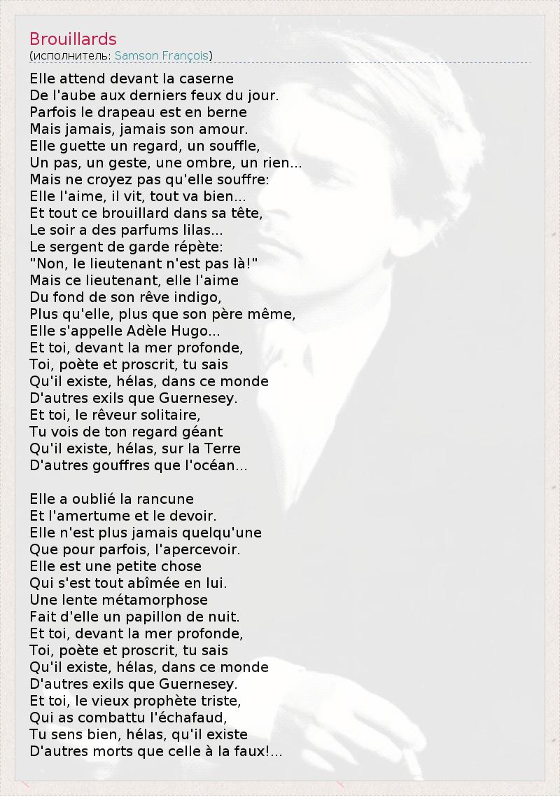 Она ждет у казармы От рассвета до последних лучей дня. Порой, знамя свернуто, Но ее любовь никогда, никогда. Он ждет взгляда, вздоха, Шаг, жеста, тени, ничего... Но не думайте, что она страдает: Она любит, она живет, все хорошо... И в ее голове этот туман, А вечер пахнет сиренью... Сержант охраны повторяет: "Нет, лейтенанта нет!", Но она любит этого лейтенанта В своей синей мечте, Больше, чем себя, даже чем своего отца, Зовут ее Адель Юго... А ты, стоя пред глубоким морем, Ты, поэт и изгнанник, ты знаешь, Что существуют, увы, в этом Ире Иные места изгнания, кроме Гернси. Ты, одинокий мечтатель, Своим величественным взглядом ты видишь, Что существуют, увы, на земле Иные бездны, помимо океана... Она позабыла злобу, Горечь и обязанность. Отныне она лишь Едва заметная тень. Она нечто незначительное, Все разрушилось в ней. Медленная метаморфоза Превратила ее в ночную бабочку. А ты, стоя пред глубоким морем, Ты, поэт и изгнанник, ты знаешь, Что существуют, увы, в этом Ире Иные места изгнания, кроме Гернси. Ты, старый печальный пророк, Что сразился с эшафотом, Ты хорошо чувствуешь, увы, что существуют Иные смерти, помимо этой напрасной!...