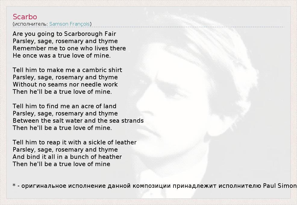 Are you going to Scarborough Fair Parsley, sage, rosemary and thyme Remember me to one who lives there He once was a true love of mine. Tell him to make me a cambric shirt Parsley, sage, rosemary and thyme Without no seams nor needle work Then he'll be a true love of mine. Tell him to find me an acre of land Parsley, sage, rosemary and thyme Between the salt water and the sea strands Then he'll be a true love of mine. Tell him to reap it with a sickle of leather Parsley, sage, rosemary and thyme And bind it all in a bunch of heather Then he'll be a true love of mine * - оригинальное исполнение данной композиции принадлежит исполнителю Paul Simon