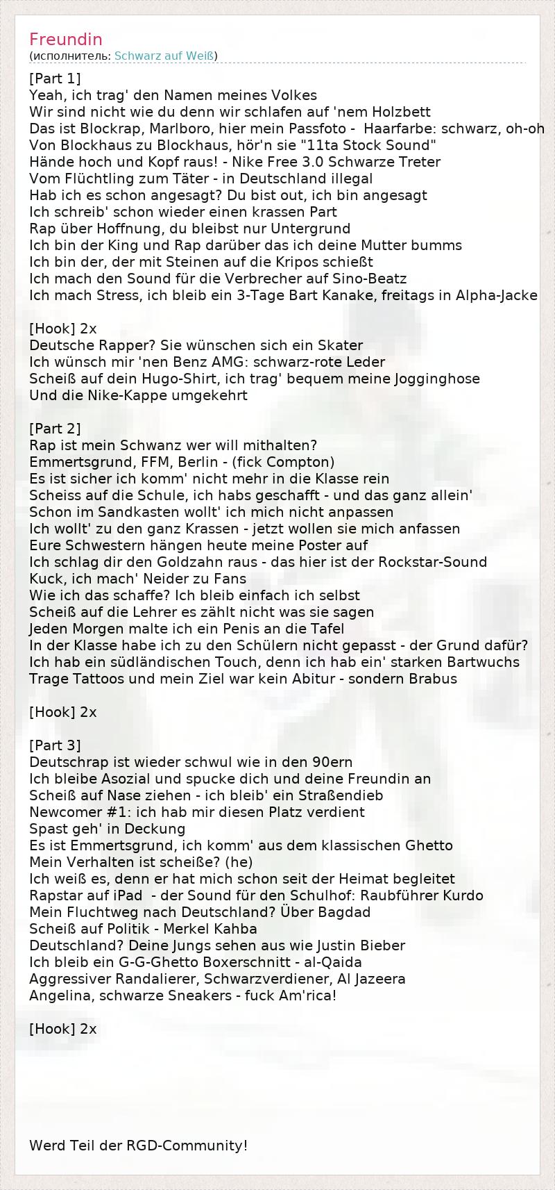 [Part 1] Yeah, ich trag' den Namen meines Volkes Wir sind nicht wie du denn wir schlafen auf 'nem Holzbett Das ist Blockrap, Marlboro, hier mein Passfoto - Haarfarbe: schwarz, oh-oh Von Blockhaus zu Blockhaus, hör'n sie "11ta Stock Sound" Hände hoch und Kopf raus! - Nike Free 3.0 Schwarze Treter Vom Flüchtling zum Täter - in Deutschland illegal Hab ich es schon angesagt? Du bist out, ich bin angesagt Ich schreib' schon wieder einen krassen Part Rap über Hoffnung, du bleibst nur Untergrund Ich bin der King und Rap darüber das ich deine Mutter bumms Ich bin der, der mit Steinen auf die Kripos schießt Ich mach den Sound für die Verbrecher auf Sino-Beatz Ich mach Stress, ich bleib ein 3-Tage Bart Kanake, freitags in Alpha-Jacke [Hook] 2x Deutsche Rapper? Sie wünschen sich ein Skater Ich wünsch mir 'nen Benz AMG: schwarz-rote Leder Scheiß auf dein Hugo-Shirt, ich trag' bequem meine Jogginghose Und die Nike-Kappe umgekehrt [Part 2] Rap ist mein Schwanz wer will mithalten? Emmertsgrund, FFM, Berlin - (fick Compton) Es ist sicher ich komm' nicht mehr in die Klasse rein Scheiss auf die Schule, ich habs geschafft - und das ganz allein' Schon im Sandkasten wollt' ich mich nicht anpassen Ich wollt' zu den ganz Krassen - jetzt wollen sie mich anfassen Eure Schwestern hängen heute meine Poster auf Ich schlag dir den Goldzahn raus - das hier ist der Rockstar-Sound Kuck, ich mach' Neider zu Fans Wie ich das schaffe? Ich bleib einfach ich selbst Scheiß auf die Lehrer es zählt nicht was sie sagen Jeden Morgen malte ich ein Penis an die Tafel In der Klasse habe ich zu den Schülern nicht gepasst - der Grund dafür? Ich hab ein südländischen Touch, denn ich hab ein' starken Bartwuchs Trage Tattoos und mein Ziel war kein Abitur - sondern Brabus [Hook] 2x [Part 3] Deutschrap ist wieder schwul wie in den 90ern Ich bleibe Asozial und spucke dich und deine Freundin an Scheiß auf Nase ziehen - ich bleib' ein Straßendieb Newcomer #1: ich hab mir diesen Platz verdient Spast geh' in Deckung Es ist Emmertsgrund, ich komm' aus dem klassischen Ghetto Mein Verhalten ist scheiße? (he) Ich weiß es, denn er hat mich schon seit der Heimat begleitet Rapstar auf iPad - der Sound für den Schulhof: Raubführer Kurdo Mein Fluchtweg nach Deutschland? Über Bagdad Scheiß auf Politik - Merkel Kahba Deutschland? Deine Jungs sehen aus wie Justin Bieber Ich bleib ein G-G-Ghetto Boxerschnitt - al-Qaida Aggressiver Randalierer, Schwarzverdiener, Al Jazeera Angelina, schwarze Sneakers - fuck Am'rica! [Hook] 2x Werd Teil der RGD-Community!