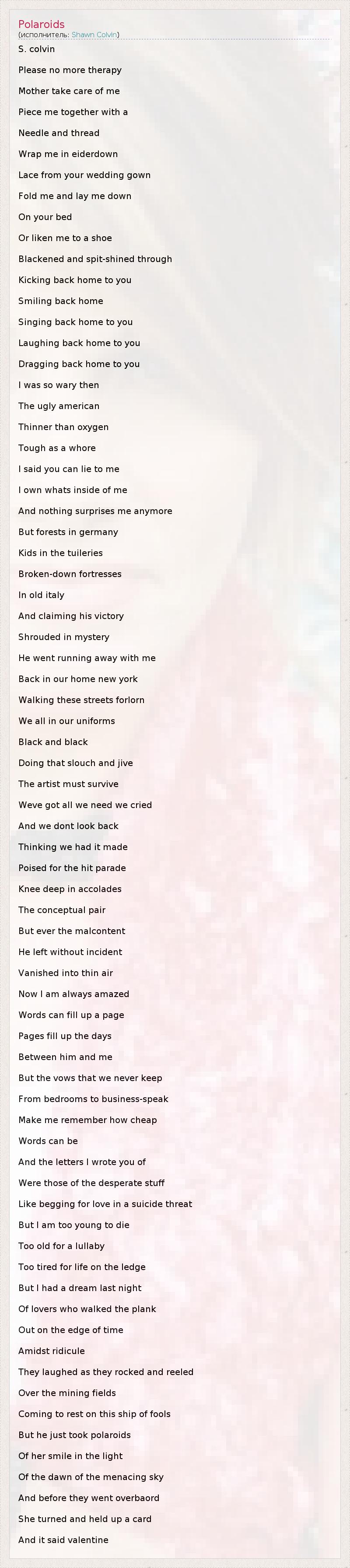 S. colvin Please no more therapy Mother take care of me Piece me together with a Needle and thread Wrap me in eiderdown Lace from your wedding gown Fold me and lay me down On your bed Or liken me to a shoe Blackened and spit-shined through Kicking back home to you Smiling back home Singing back home to you Laughing back home to you Dragging back home to you I was so wary then The ugly american Thinner than oxygen Tough as a whore I said you can lie to me I own whats inside of me And nothing surprises me anymore But forests in germany Kids in the tuileries Broken-down fortresses In old italy And claiming his victory Shrouded in mystery He went running away with me Back in our home new york Walking these streets forlorn We all in our uniforms Black and black Doing that slouch and jive The artist must survive Weve got all we need we cried And we dont look back Thinking we had it made Poised for the hit parade Knee deep in accolades The conceptual pair But ever the malcontent He left without incident Vanished into thin air Now I am always amazed Words can fill up a page Pages fill up the days Between him and me But the vows that we never keep From bedrooms to business-speak Make me remember how cheap Words can be And the letters I wrote you of Were those of the desperate stuff Like begging for love in a suicide threat But I am too young to die Too old for a lullaby Too tired for life on the ledge But I had a dream last night Of lovers who walked the plank Out on the edge of time Amidst ridicule They laughed as they rocked and reeled Over the mining fields Coming to rest on this ship of fools But he just took polaroids Of her smile in the light Of the dawn of the menacing sky And before they went overbaord She turned and held up a card And it said valentine