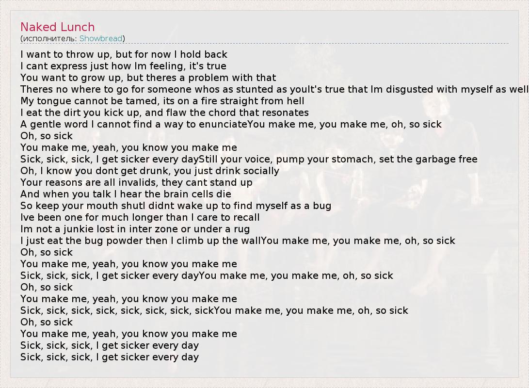 I want to throw up, but for now I hold back I cant express just how Im feeling, it's true You want to grow up, but theres a problem with that Theres no where to go for someone whos as stunted as youIt's true that Im disgusted with myself as well My tongue cannot be tamed, its on a fire straight from hell I eat the dirt you kick up, and flaw the chord that resonates A gentle word I cannot find a way to enunciateYou make me, you make me, oh, so sick Oh, so sick You make me, yeah, you know you make me Sick, sick, sick, I get sicker every dayStill your voice, pump your stomach, set the garbage free Oh, I know you dont get drunk, you just drink socially Your reasons are all invalids, they cant stand up And when you talk I hear the brain cells die So keep your mouth shutI didnt wake up to find myself as a bug Ive been one for much longer than I care to recall Im not a junkie lost in inter zone or under a rug I just eat the bug powder then I climb up the wallYou make me, you make me, oh, so sick Oh, so sick You make me, yeah, you know you make me Sick, sick, sick, I get sicker every dayYou make me, you make me, oh, so sick Oh, so sick You make me, yeah, you know you make me Sick, sick, sick, sick, sick, sick, sick, sickYou make me, you make me, oh, so sick Oh, so sick You make me, yeah, you know you make me Sick, sick, sick, I get sicker every day Sick, sick, sick, I get sicker every day