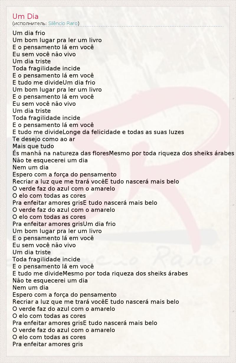 Um dia frio Um bom lugar pra ler um livro E o pensamento lá em você Eu sem você não vivo Um dia triste Toda fragilidade incide E o pensamento lá em você E tudo me divideUm dia frio Um bom lugar pra ler um livro E o pensamento lá em você Eu sem você não vivo Um dia triste Toda fragilidade incide E o pensamento lá em você E tudo me divideLonge da felicidade e todas as suas luzes Te desejo como ao ar Mais que tudo És manhã na natureza das floresMesmo por toda riqueza dos sheiks árabes Não te esquecerei um dia Nem um dia Espero com a força do pensamento Recriar a luz que me trará vocêE tudo nascerá mais belo O verde faz do azul com o amarelo O elo com todas as cores Pra enfeitar amores grisE tudo nascerá mais belo O verde faz do azul com o amarelo O elo com todas as cores Pra enfeitar amores grisUm dia frio Um bom lugar pra ler um livro E o pensamento lá em você Eu sem você não vivo Um dia triste Toda fragilidade incide E o pensamento lá em você E tudo me divideMesmo por toda riqueza dos sheiks árabes Não te esquecerei um dia Nem um dia Espero com a força do pensamento Recriar a luz que me trará vocêE tudo nascerá mais belo O verde faz do azul com o amarelo O elo com todas as cores Pra enfeitar amores grisE tudo nascerá mais belo O verde faz do azul com o amarelo O elo com todas as cores Pra enfeitar amores gris