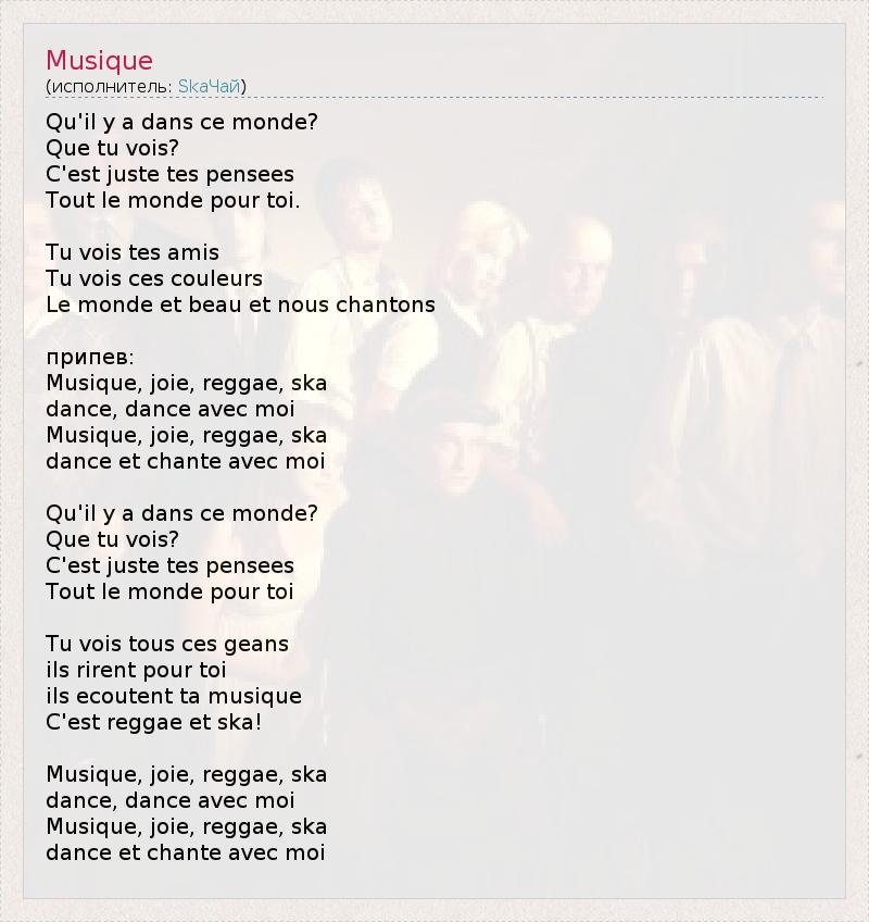Qu'il y a dans ce monde? Que tu vois? C'est juste tes pensees Tout le monde pour toi. Tu vois tes amis Tu vois ces couleurs Le monde et beau et nous chantons припев: Musique, joie, reggae, ska dance, dance avec moi Musique, joie, reggae, ska dance et chante avec moi Qu'il y a dans ce monde? Que tu vois? C'est juste tes pensees Tout le monde pour toi Tu vois tous ces geans ils rirent pour toi ils ecoutent ta musique C'est reggae et ska! Musique, joie, reggae, ska dance, dance avec moi Musique, joie, reggae, ska dance et chante avec moi