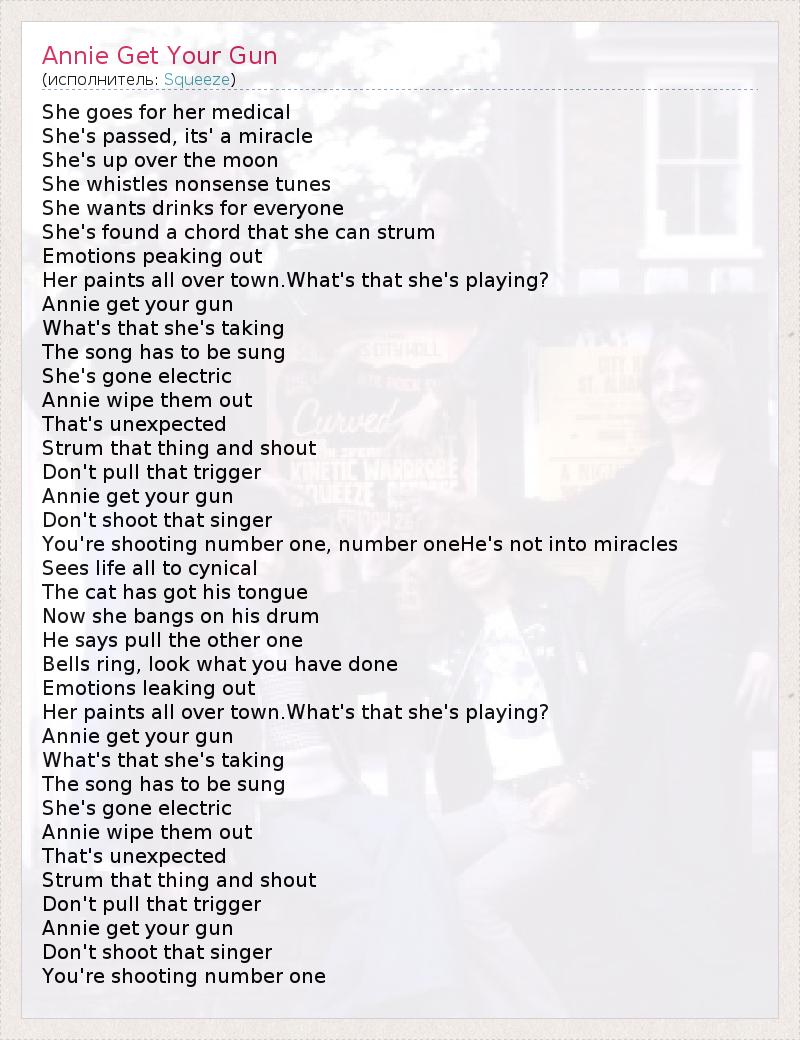 She goes for her medical She's passed, its' a miracle She's up over the moon She whistles nonsense tunes She wants drinks for everyone She's found a chord that she can strum Emotions peaking out Her paints all over town.What's that she's playing? Annie get your gun What's that she's taking The song has to be sung She's gone electric Annie wipe them out That's unexpected Strum that thing and shout Don't pull that trigger Annie get your gun Don't shoot that singer You're shooting number one, number oneHe's not into miracles Sees life all to cynical The cat has got his tongue Now she bangs on his drum He says pull the other one Bells ring, look what you have done Emotions leaking out Her paints all over town.What's that she's playing? Annie get your gun What's that she's taking The song has to be sung She's gone electric Annie wipe them out That's unexpected Strum that thing and shout Don't pull that trigger Annie get your gun Don't shoot that singer You're shooting number one
