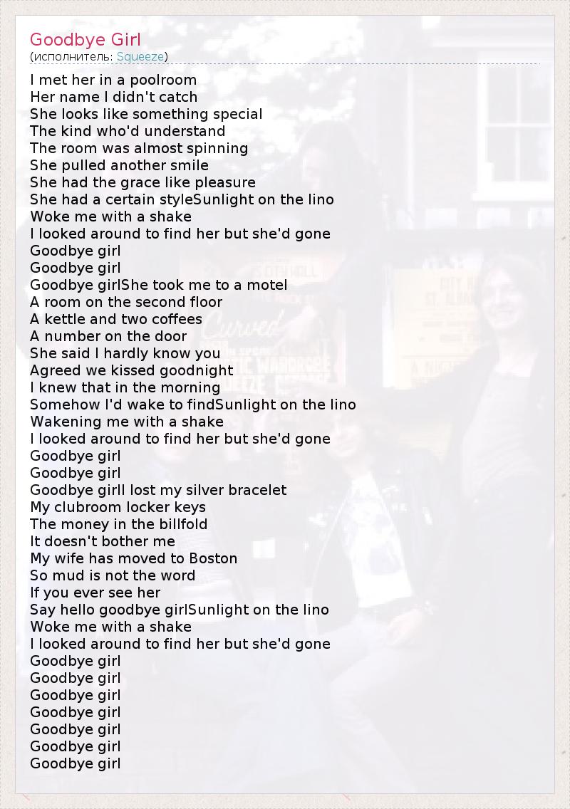 I met her in a poolroom Her name I didn't catch She looks like something special The kind who'd understand The room was almost spinning She pulled another smile She had the grace like pleasure She had a certain styleSunlight on the lino Woke me with a shake I looked around to find her but she'd gone Goodbye girl Goodbye girl Goodbye girlShe took me to a motel A room on the second floor A kettle and two coffees A number on the door She said I hardly know you Agreed we kissed goodnight I knew that in the morning Somehow I'd wake to findSunlight on the lino Wakening me with a shake I looked around to find her but she'd gone Goodbye girl Goodbye girl Goodbye girlI lost my silver bracelet My clubroom locker keys The money in the billfold It doesn't bother me My wife has moved to Boston So mud is not the word If you ever see her Say hello goodbye girlSunlight on the lino Woke me with a shake I looked around to find her but she'd gone Goodbye girl Goodbye girl Goodbye girl Goodbye girl Goodbye girl Goodbye girl Goodbye girl