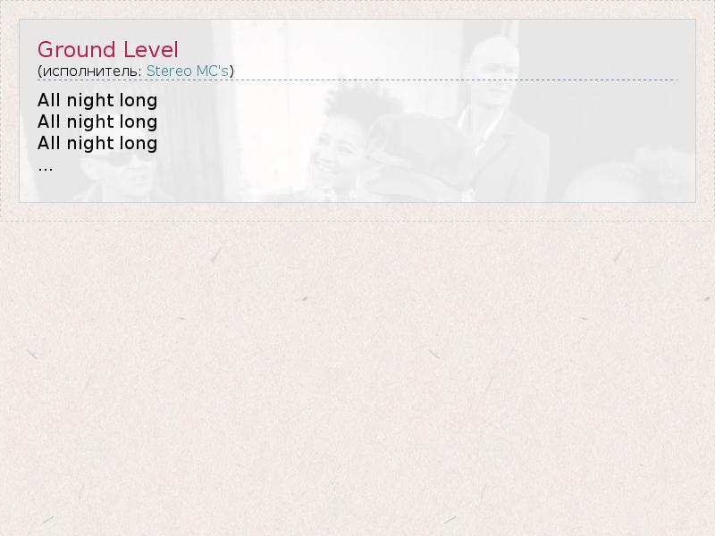 Это интересно:Патриархи британского хип-хопа Stereo MC's, отмечающие в 2005 году двадцатилетний юбилей, испытали на прочность череду самых разных стилей. Они делали электронную музыку, хаус, эйсид-джаз, танцевальные композиции, трип-хоп и рэп. Редкие группы способны переварить такое разнообразное меню. В карьере Stereo MC's были периоды более или менее успешные, был период почти полного затишья: на восемь... продолжение