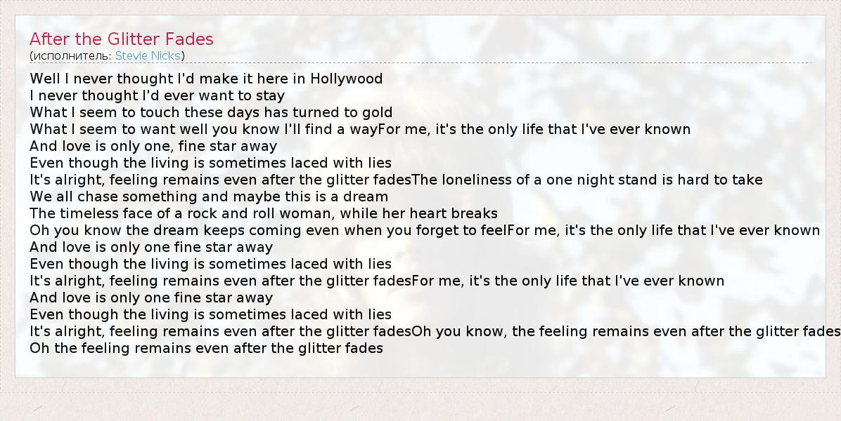 Well I never thought I'd make it here in Hollywood I never thought I'd ever want to stay What I seem to touch these days has turned to gold What I seem to want well you know I'll find a wayFor me, it's the only life that I've ever known And love is only one, fine star away Even though the living is sometimes laced with lies It's alright, feeling remains even after the glitter fadesThe loneliness of a one night stand is hard to take We all chase something and maybe this is a dream The timeless face of a rock and roll woman, while her heart breaks Oh you know the dream keeps coming even when you forget to feelFor me, it's the only life that I've ever known And love is only one fine star away Even though the living is sometimes laced with lies It's alright, feeling remains even after the glitter fadesFor me, it's the only life that I've ever known And love is only one fine star away Even though the living is sometimes laced with lies It's alright, feeling remains even after the glitter fadesOh you know, the feeling remains even after the glitter fades Oh the feeling remains even after the glitter fades