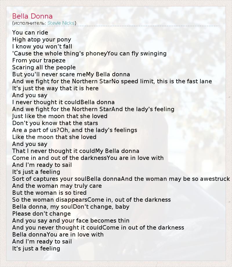 You can ride High atop your pony I know you won't fall 'Cause the whole thing's phoneyYou can fly swinging From your trapeze Scaring all the people But you'll never scare meMy Bella donna And we fight for the Northern StarNo speed limit, this is the fast lane It's just the way that it is here And you say I never thought it couldBella donna And we fight for the Northern StarAnd the lady's feeling Just like the moon that she loved Don't you know that the stars Are a part of us?Oh, and the lady's feelings Like the moon that she loved And you say That I never thought it couldMy Bella donna Come in and out of the darknessYou are in love with And I'm ready to sail It's just a feeling Sort of captures your soulBella donnaAnd the woman may be so awestruck And the woman may truly care But the woman is so tired So the woman disappearsCome in, out of the darkness Bella donna, my soulDon't change, baby Please don't change And you say and your face becomes thin And you never thought it couldCome in out of the darkness Bella donnaYou are in love with And I'm ready to sail It's just a feeling