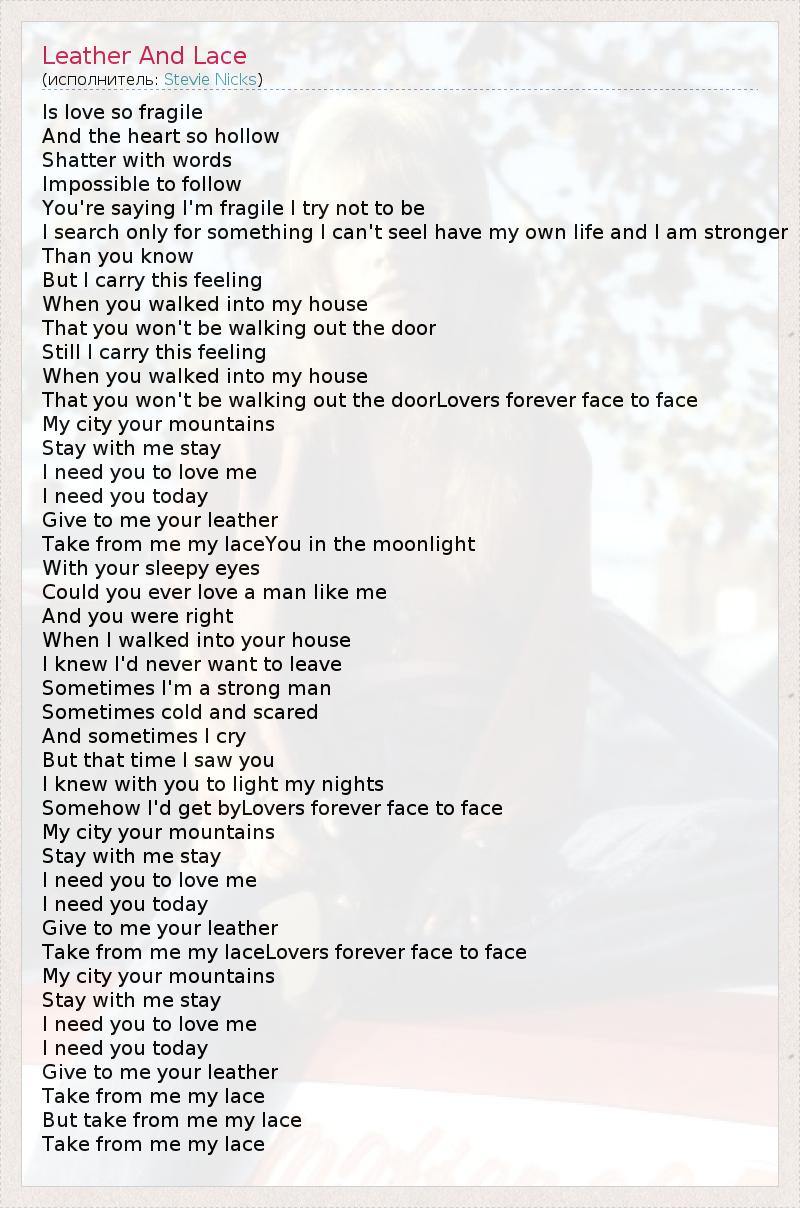 Is love so fragile And the heart so hollow Shatter with words Impossible to follow You're saying I'm fragile I try not to be I search only for something I can't seeI have my own life and I am stronger Than you know But I carry this feeling When you walked into my house That you won't be walking out the door Still I carry this feeling When you walked into my house That you won't be walking out the doorLovers forever face to face My city your mountains Stay with me stay I need you to love me I need you today Give to me your leather Take from me my laceYou in the moonlight With your sleepy eyes Could you ever love a man like me And you were right When I walked into your house I knew I'd never want to leave Sometimes I'm a strong man Sometimes cold and scared And sometimes I cry But that time I saw you I knew with you to light my nights Somehow I'd get byLovers forever face to face My city your mountains Stay with me stay I need you to love me I need you today Give to me your leather Take from me my laceLovers forever face to face My city your mountains Stay with me stay I need you to love me I need you today Give to me your leather Take from me my lace But take from me my lace Take from me my lace