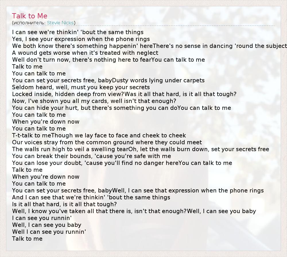 I can see we're thinkin' 'bout the same things Yes, I see your expression when the phone rings We both know there's something happenin' hereThere's no sense in dancing 'round the subject A wound gets worse when it's treated with neglect Well don't turn now, there's nothing here to fearYou can talk to me Talk to me You can talk to me You can set your secrets free, babyDusty words lying under carpets Seldom heard, well, must you keep your secrets Locked inside, hidden deep from view?Was it all that hard, is it all that tough? Now, I've shown you all my cards, well isn't that enough? You can hide your hurt, but there's something you can doYou can talk to me You can talk to me When you're down now You can talk to me T-t-talk to meThough we lay face to face and cheek to cheek Our voices stray from the common ground where they could meet The walls run high to veil a swelling tearOh, let the walls burn down, set your secrets free You can break their bounds, 'cause you're safe with me You can lose your doubt, 'cause you'll find no danger hereYou can talk to me Talk to me When you're down now You can talk to me You can set your secrets free, babyWell, I can see that expression when the phone rings And I can see that we're thinkin' 'bout the same things Is it all that hard, is it all that tough? Well, I know you've taken all that there is, isn't that enough?Well, I can see you baby I can see you runnin' Well, I can see you baby Well I can see you runnin' Talk to me