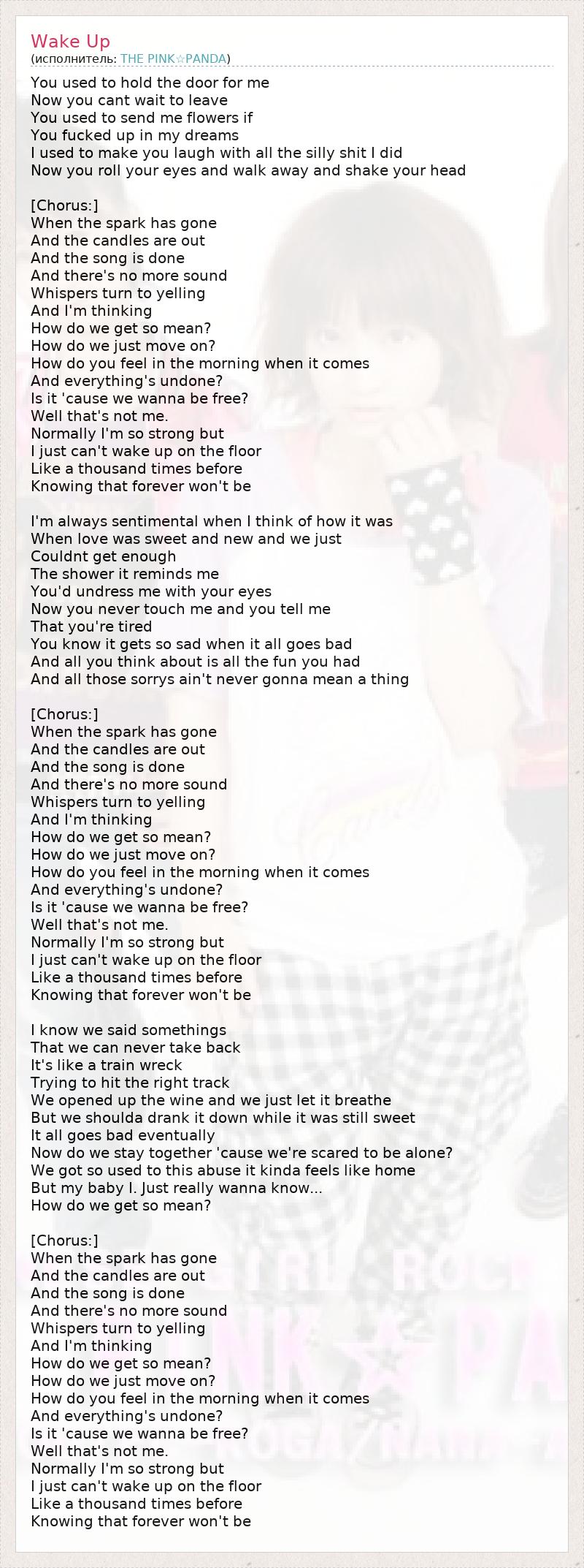 You used to hold the door for me Now you cant wait to leave You used to send me flowers if You fucked up in my dreams I used to make you laugh with all the silly shit I did Now you roll your eyes and walk away and shake your head [Chorus:] When the spark has gone And the candles are out And the song is done And there's no more sound Whispers turn to yelling And I'm thinking How do we get so mean? How do we just move on? How do you feel in the morning when it comes And everything's undone? Is it 'cause we wanna be free? Well that's not me. Normally I'm so strong but I just can't wake up on the floor Like a thousand times before Knowing that forever won't be I'm always sentimental when I think of how it was When love was sweet and new and we just Couldnt get enough The shower it reminds me You'd undress me with your eyes Now you never touch me and you tell me That you're tired You know it gets so sad when it all goes bad And all you think about is all the fun you had And all those sorrys ain't never gonna mean a thing [Chorus:] When the spark has gone And the candles are out And the song is done And there's no more sound Whispers turn to yelling And I'm thinking How do we get so mean? How do we just move on? How do you feel in the morning when it comes And everything's undone? Is it 'cause we wanna be free? Well that's not me. Normally I'm so strong but I just can't wake up on the floor Like a thousand times before Knowing that forever won't be I know we said somethings That we can never take back It's like a train wreck Trying to hit the right track We opened up the wine and we just let it breathe But we shoulda drank it down while it was still sweet It all goes bad eventually Now do we stay together 'cause we're scared to be alone? We got so used to this abuse it kinda feels like home But my baby I. Just really wanna know... How do we get so mean? [Chorus:] When the spark has gone And the candles are out And the song is done And there's no more sound Whispers turn to yelling And I'm thinking How do we get so mean? How do we just move on? How do you feel in the morning when it comes And everything's undone? Is it 'cause we wanna be free? Well that's not me. Normally I'm so strong but I just can't wake up on the floor Like a thousand times before Knowing that forever won't be