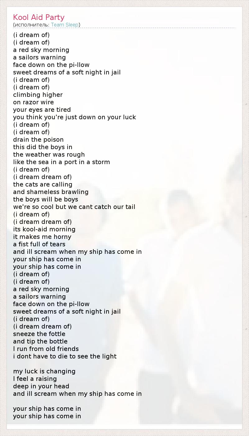 (i dream of) (i dream of) a red sky morning a sailors warning face down on the pi-llow sweet dreams of a soft night in jail (i dream of) (i dream of) climbing higher on razor wire your eyes are tired you think you're just down on your luck (i dream of) (i dream of) drain the poison this did the boys in the weather was rough like the sea in a port in a storm (i dream of) (i dream dream of) the cats are calling and shameless brawling the boys will be boys we're so cool but we cant catch our tail (i dream of) (i dream dream of) its kool-aid morning it makes me horny a fist full of tears and ill scream when my ship has come in your ship has come in your ship has come in (i dream of) (i dream of) a red sky morning a sailors warning face down on the pi-llow sweet dreams of a soft night in jail (i dream of) (i dream dream of) sneeze the fottle and tip the bottle I run from old friends i dont have to die to see the light my luck is changing I feel a raising deep in your head and ill scream when my ship has come in your ship has come in your ship has come in