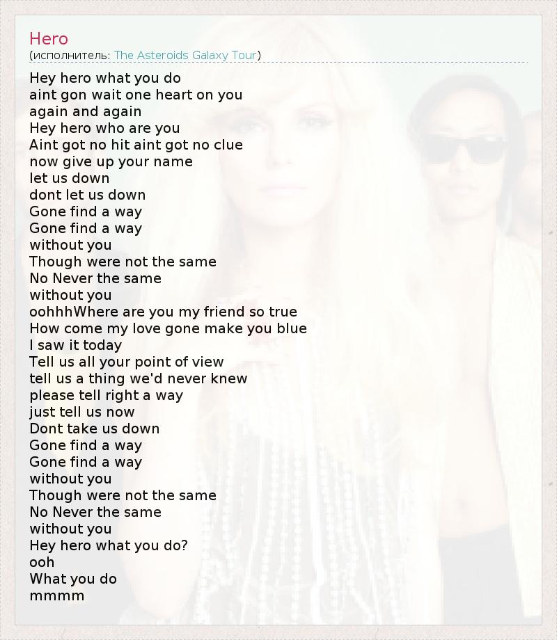 Hey hero what you do aint gon wait one heart on you again and again Hey hero who are you Aint got no hit aint got no clue now give up your name let us down dont let us down Gone find a way Gone find a way without you Though were not the same No Never the same without you oohhhWhere are you my friend so true How come my love gone make you blue I saw it today Tell us all your point of view tell us a thing we'd never knew please tell right a way just tell us now Dont take us down Gone find a way Gone find a way without you Though were not the same No Never the same without you Hey hero what you do? ooh What you do mmmm