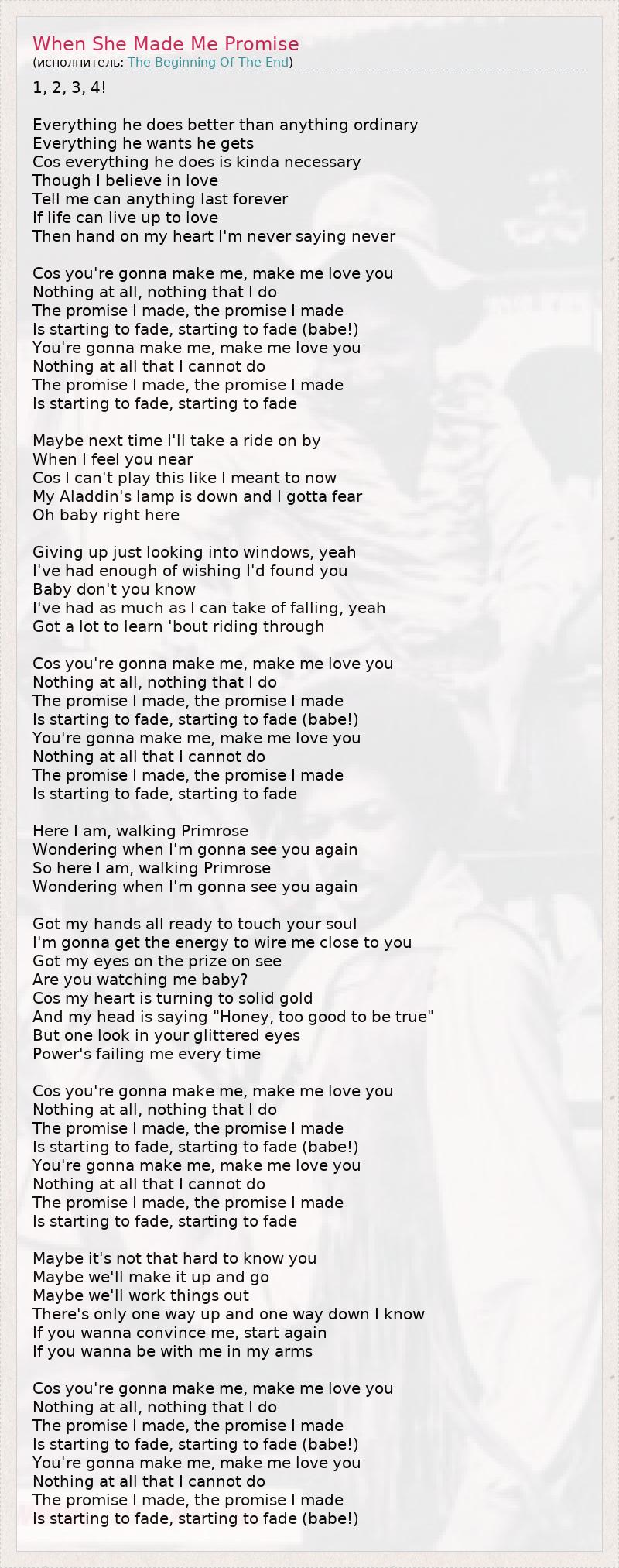 1, 2, 3, 4! Everything he does better than anything ordinary Everything he wants he gets Cos everything he does is kinda necessary Though I believe in love Tell me can anything last forever If life can live up to love Then hand on my heart I'm never saying never Cos you're gonna make me, make me love you Nothing at all, nothing that I do The promise I made, the promise I made Is starting to fade, starting to fade (babe!) You're gonna make me, make me love you Nothing at all that I cannot do The promise I made, the promise I made Is starting to fade, starting to fade Maybe next time I'll take a ride on by When I feel you near Cos I can't play this like I meant to now My Aladdin's lamp is down and I gotta fear Oh baby right here Giving up just looking into windows, yeah I've had enough of wishing I'd found you Baby don't you know I've had as much as I can take of falling, yeah Got a lot to learn 'bout riding through Cos you're gonna make me, make me love you Nothing at all, nothing that I do The promise I made, the promise I made Is starting to fade, starting to fade (babe!) You're gonna make me, make me love you Nothing at all that I cannot do The promise I made, the promise I made Is starting to fade, starting to fade Here I am, walking Primrose Wondering when I'm gonna see you again So here I am, walking Primrose Wondering when I'm gonna see you again Got my hands all ready to touch your soul I'm gonna get the energy to wire me close to you Got my eyes on the prize on see Are you watching me baby? Cos my heart is turning to solid gold And my head is saying "Honey, too good to be true" But one look in your glittered eyes Power's failing me every time Cos you're gonna make me, make me love you Nothing at all, nothing that I do The promise I made, the promise I made Is starting to fade, starting to fade (babe!) You're gonna make me, make me love you Nothing at all that I cannot do The promise I made, the promise I made Is starting to fade, starting to fade Maybe it's not that hard to know you Maybe we'll make it up and go Maybe we'll work things out There's only one way up and one way down I know If you wanna convince me, start again If you wanna be with me in my arms Cos you're gonna make me, make me love you Nothing at all, nothing that I do The promise I made, the promise I made Is starting to fade, starting to fade (babe!) You're gonna make me, make me love you Nothing at all that I cannot do The promise I made, the promise I made Is starting to fade, starting to fade (babe!)