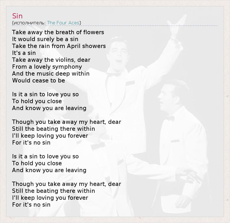 Take away the breath of flowers It would surely be a sin Take the rain from April showers It's a sin Take away the violins, dear From a lovely symphony And the music deep within Would cease to be Is it a sin to love you so To hold you close And know you are leaving Though you take away my heart, dear Still the beating there within I'll keep loving you forever For it's no sin Is it a sin to love you so To hold you close And know you are leaving Though you take away my heart, dear Still the beating there within I'll keep loving you forever For it's no sin