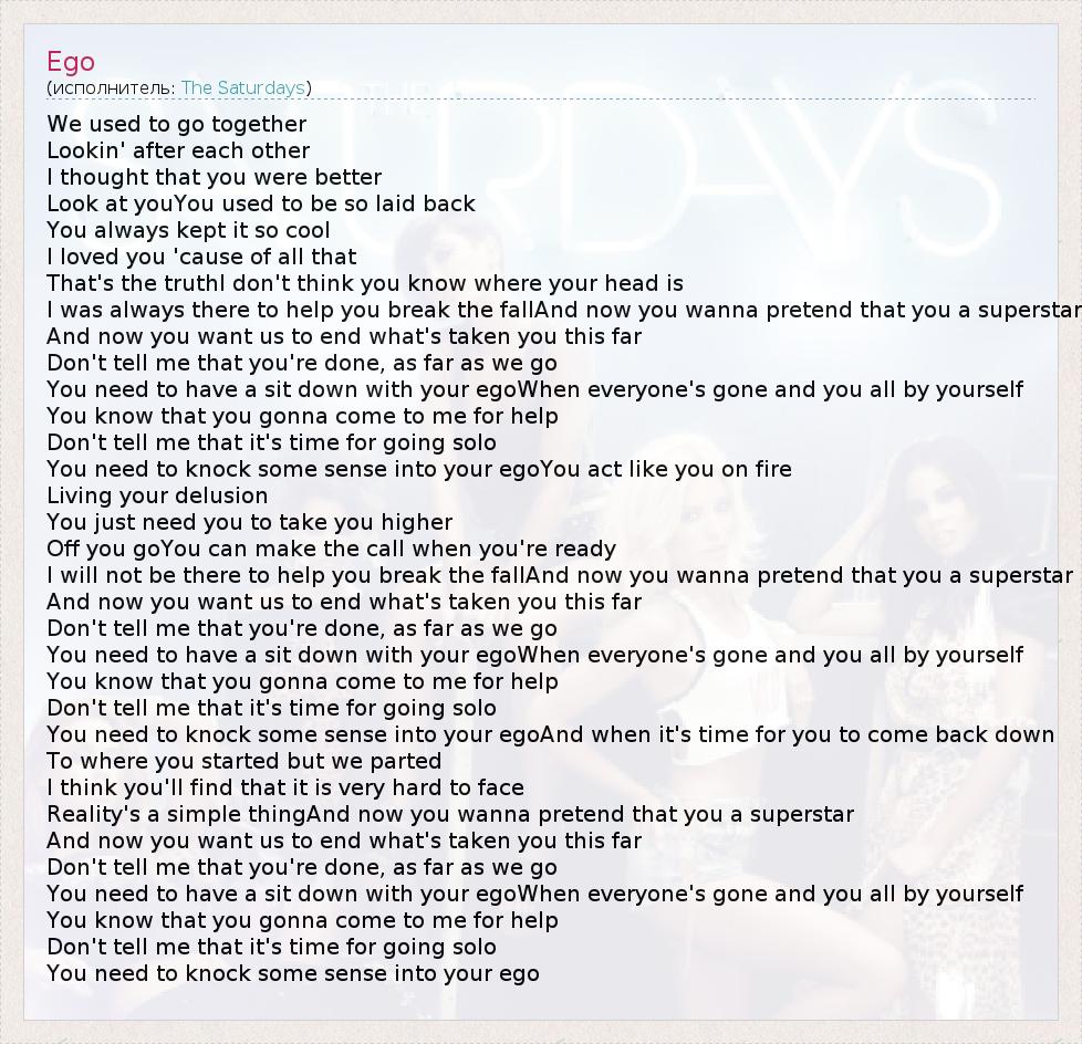 We used to go together Lookin' after each other I thought that you were better Look at youYou used to be so laid back You always kept it so cool I loved you 'cause of all that That's the truthI don't think you know where your head is I was always there to help you break the fallAnd now you wanna pretend that you a superstar And now you want us to end what's taken you this far Don't tell me that you're done, as far as we go You need to have a sit down with your egoWhen everyone's gone and you all by yourself You know that you gonna come to me for help Don't tell me that it's time for going solo You need to knock some sense into your egoYou act like you on fire Living your delusion You just need you to take you higher Off you goYou can make the call when you're ready I will not be there to help you break the fallAnd now you wanna pretend that you a superstar And now you want us to end what's taken you this far Don't tell me that you're done, as far as we go You need to have a sit down with your egoWhen everyone's gone and you all by yourself You know that you gonna come to me for help Don't tell me that it's time for going solo You need to knock some sense into your egoAnd when it's time for you to come back down To where you started but we parted I think you'll find that it is very hard to face Reality's a simple thingAnd now you wanna pretend that you a superstar And now you want us to end what's taken you this far Don't tell me that you're done, as far as we go You need to have a sit down with your egoWhen everyone's gone and you all by yourself You know that you gonna come to me for help Don't tell me that it's time for going solo You need to knock some sense into your ego
