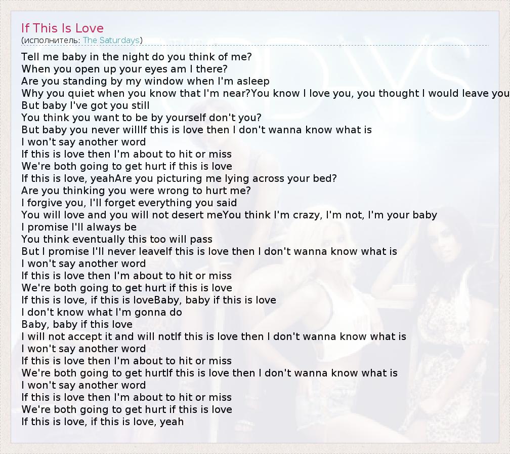 Tell me baby in the night do you think of me? When you open up your eyes am I there? Are you standing by my window when I'm asleep Why you quiet when you know that I'm near?You know I love you, you thought I would leave you But baby I've got you still You think you want to be by yourself don't you? But baby you never willIf this is love then I don't wanna know what is I won't say another word If this is love then I'm about to hit or miss We're both going to get hurt if this is love If this is love, yeahAre you picturing me lying across your bed? Are you thinking you were wrong to hurt me? I forgive you, I'll forget everything you said You will love and you will not desert meYou think I'm crazy, I'm not, I'm your baby I promise I'll always be You think eventually this too will pass But I promise I'll never leaveIf this is love then I don't wanna know what is I won't say another word If this is love then I'm about to hit or miss We're both going to get hurt if this is love If this is love, if this is loveBaby, baby if this is love I don't know what I'm gonna do Baby, baby if this love I will not accept it and will notIf this is love then I don't wanna know what is I won't say another word If this is love then I'm about to hit or miss We're both going to get hurtIf this is love then I don't wanna know what is I won't say another word If this is love then I'm about to hit or miss We're both going to get hurt if this is love If this is love, if this is love, yeah