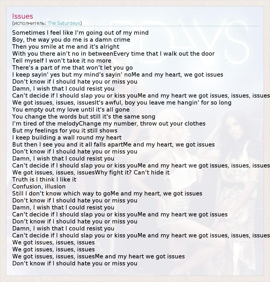 Sometimes I feel like I'm going out of my mind Boy, the way you do me is a damn crime Then you smile at me and it's alright With you there ain't no in betweenEvery time that I walk out the door Tell myself I won't take it no more There's a part of me that won't let you go I keep sayin' yes but my mind's sayin' noMe and my heart, we got issues Don't know if I should hate you or miss you Damn, I wish that I could resist you Can't decide if I should slap you or kiss youMe and my heart we got issues, issues, issues We got issues, issues, issuesIt's awful, boy you leave me hangin' for so long You empty out my love until it's all gone You change the words but still it's the same song I'm tired of the melodyChange my number, throw out your clothes But my feelings for you it still shows I keep building a wall round my heart But then I see you and it all falls apartMe and my heart, we got issues Don't know if I should hate you or miss you Damn, I wish that I could resist you Can't decide if I should slap you or kiss youMe and my heart we got issues, issues, issues We got issues, issues, issuesWhy fight it? Can't hide it Truth is I think I like it Confusion, illusion Still I don't know which way to goMe and my heart, we got issues Don't know if I should hate you or miss you Damn, I wish that I could resist you Can't decide if I should slap you or kiss youMe and my heart we got issues Don't know if I should hate you or miss you Damn, I wish that I could resist you Can't decide if I should slap you or kiss youMe and my heart we got issues, issues, issues We got issues, issues, issues We got issues, issues, issues We got issues, issues, issuesMe and my heart we got issues Don't know if I should hate you or miss you