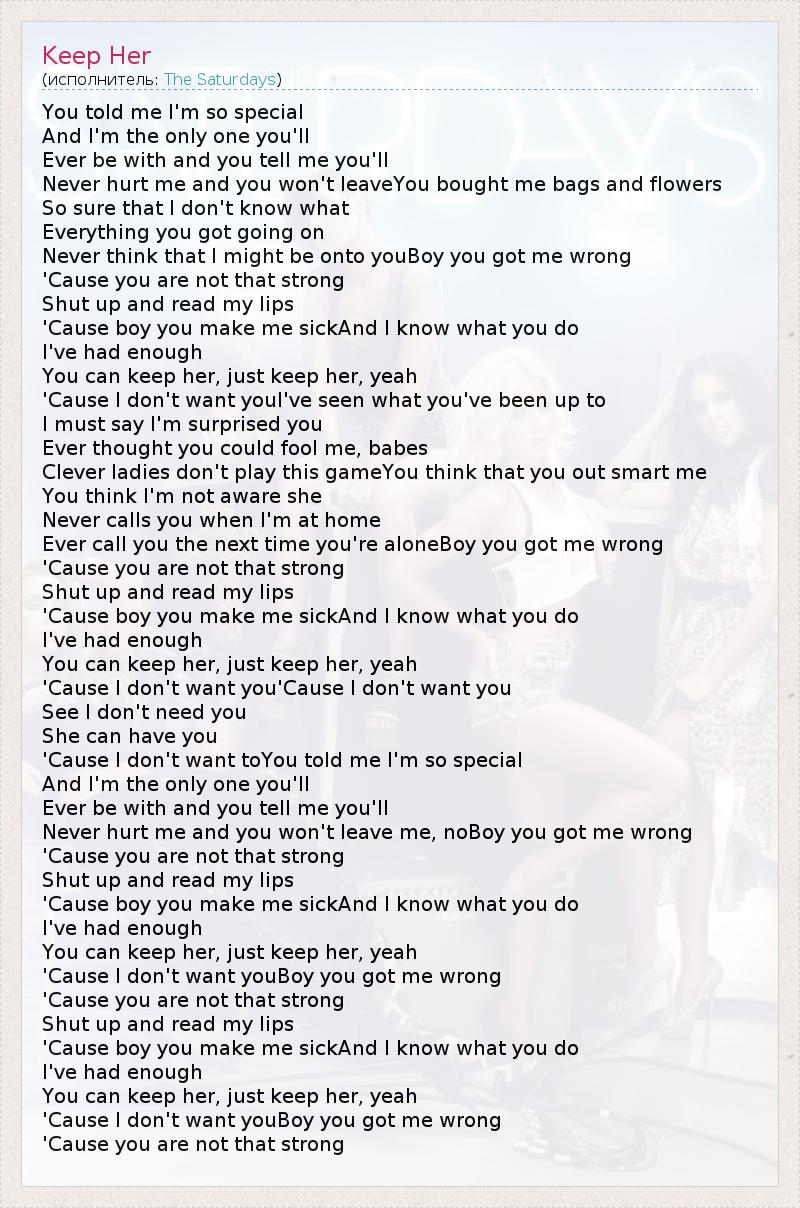 You told me I'm so special And I'm the only one you'll Ever be with and you tell me you'll Never hurt me and you won't leaveYou bought me bags and flowers So sure that I don't know what Everything you got going on Never think that I might be onto youBoy you got me wrong 'Cause you are not that strong Shut up and read my lips 'Cause boy you make me sickAnd I know what you do I've had enough You can keep her, just keep her, yeah 'Cause I don't want youI've seen what you've been up to I must say I'm surprised you Ever thought you could fool me, babes Clever ladies don't play this gameYou think that you out smart me You think I'm not aware she Never calls you when I'm at home Ever call you the next time you're aloneBoy you got me wrong 'Cause you are not that strong Shut up and read my lips 'Cause boy you make me sickAnd I know what you do I've had enough You can keep her, just keep her, yeah 'Cause I don't want you'Cause I don't want you See I don't need you She can have you 'Cause I don't want toYou told me I'm so special And I'm the only one you'll Ever be with and you tell me you'll Never hurt me and you won't leave me, noBoy you got me wrong 'Cause you are not that strong Shut up and read my lips 'Cause boy you make me sickAnd I know what you do I've had enough You can keep her, just keep her, yeah 'Cause I don't want youBoy you got me wrong 'Cause you are not that strong Shut up and read my lips 'Cause boy you make me sickAnd I know what you do I've had enough You can keep her, just keep her, yeah 'Cause I don't want youBoy you got me wrong 'Cause you are not that strong