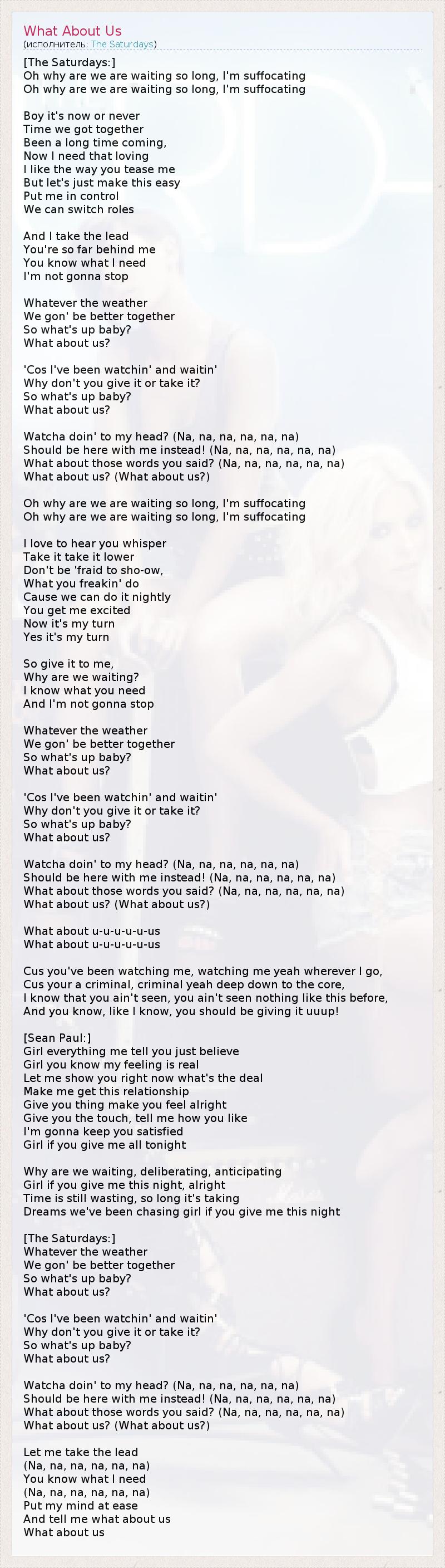 [The Saturdays:] Oh why are we are waiting so long, I'm suffocating Oh why are we are waiting so long, I'm suffocating Boy it's now or never Time we got together Been a long time coming, Now I need that loving I like the way you tease me But let's just make this easy Put me in control We can switch roles And I take the lead You're so far behind me You know what I need I'm not gonna stop Whatever the weather We gon' be better together So what's up baby? What about us? 'Cos I've been watchin' and waitin' Why don't you give it or take it? So what's up baby? What about us? Watcha doin' to my head? (Na, na, na, na, na, na) Should be here with me instead! (Na, na, na, na, na, na) What about those words you said? (Na, na, na, na, na, na) What about us? (What about us?) Oh why are we are waiting so long, I'm suffocating Oh why are we are waiting so long, I'm suffocating I love to hear you whisper Take it take it lower Don't be 'fraid to sho-ow, What you freakin' do Cause we can do it nightly You get me excited Now it's my turn Yes it's my turn So give it to me, Why are we waiting? I know what you need And I'm not gonna stop Whatever the weather We gon' be better together So what's up baby? What about us? 'Cos I've been watchin' and waitin' Why don't you give it or take it? So what's up baby? What about us? Watcha doin' to my head? (Na, na, na, na, na, na) Should be here with me instead! (Na, na, na, na, na, na) What about those words you said? (Na, na, na, na, na, na) What about us? (What about us?) What about u-u-u-u-u-us What about u-u-u-u-u-us Cus you've been watching me, watching me yeah wherever I go, Cus your a criminal, criminal yeah deep down to the core, I know that you ain't seen, you ain't seen nothing like this before, And you know, like I know, you should be giving it uuup! [Sean Paul:] Girl everything me tell you just believe Girl you know my feeling is real Let me show you right now what's the deal Make me get this relationship Give you thing make you feel alright Give you the touch, tell me how you like I'm gonna keep you satisfied Girl if you give me all tonight Why are we waiting, deliberating, anticipating Girl if you give me this night, alright Time is still wasting, so long it's taking Dreams we've been chasing girl if you give me this night [The Saturdays:] Whatever the weather We gon' be better together So what's up baby? What about us? 'Cos I've been watchin' and waitin' Why don't you give it or take it? So what's up baby? What about us? Watcha doin' to my head? (Na, na, na, na, na, na) Should be here with me instead! (Na, na, na, na, na, na) What about those words you said? (Na, na, na, na, na, na) What about us? (What about us?) Let me take the lead (Na, na, na, na, na, na) You know what I need (Na, na, na, na, na, na) Put my mind at ease And tell me what about us What about us