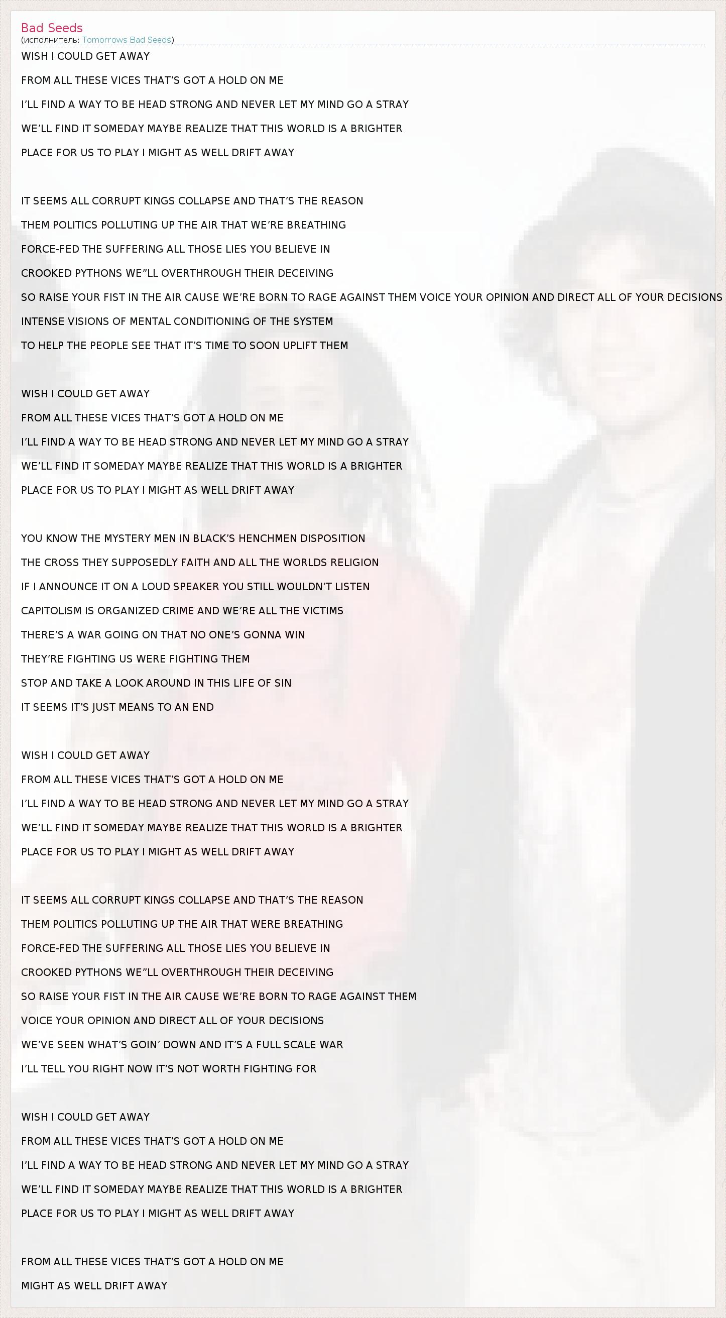 WISH I COULD GET AWAY FROM ALL THESE VICES THAT’S GOT A HOLD ON ME I’LL FIND A WAY TO BE HEAD STRONG AND NEVER LET MY MIND GO A STRAY WE’LL FIND IT SOMEDAY MAYBE REALIZE THAT THIS WORLD IS A BRIGHTER PLACE FOR US TO PLAY I MIGHT AS WELL DRIFT AWAY IT SEEMS ALL CORRUPT KINGS COLLAPSE AND THAT’S THE REASON THEM POLITICS POLLUTING UP THE AIR THAT WE’RE BREATHING FORCE-FED THE SUFFERING ALL THOSE LIES YOU BELIEVE IN CROOKED PYTHONS WE”LL OVERTHROUGH THEIR DECEIVING SO RAISE YOUR FIST IN THE AIR CAUSE WE’RE BORN TO RAGE AGAINST THEM VOICE YOUR OPINION AND DIRECT ALL OF YOUR DECISIONS INTENSE VISIONS OF MENTAL CONDITIONING OF THE SYSTEM TO HELP THE PEOPLE SEE THAT IT’S TIME TO SOON UPLIFT THEM WISH I COULD GET AWAY FROM ALL THESE VICES THAT’S GOT A HOLD ON ME I’LL FIND A WAY TO BE HEAD STRONG AND NEVER LET MY MIND GO A STRAY WE’LL FIND IT SOMEDAY MAYBE REALIZE THAT THIS WORLD IS A BRIGHTER PLACE FOR US TO PLAY I MIGHT AS WELL DRIFT AWAY YOU KNOW THE MYSTERY MEN IN BLACK’S HENCHMEN DISPOSITION THE CROSS THEY SUPPOSEDLY FAITH AND ALL THE WORLDS RELIGION IF I ANNOUNCE IT ON A LOUD SPEAKER YOU STILL WOULDN’T LISTEN CAPITOLISM IS ORGANIZED CRIME AND WE’RE ALL THE VICTIMS THERE’S A WAR GOING ON THAT NO ONE’S GONNA WIN THEY’RE FIGHTING US WERE FIGHTING THEM STOP AND TAKE A LOOK AROUND IN THIS LIFE OF SIN IT SEEMS IT’S JUST MEANS TO AN END WISH I COULD GET AWAY FROM ALL THESE VICES THAT’S GOT A HOLD ON ME I’LL FIND A WAY TO BE HEAD STRONG AND NEVER LET MY MIND GO A STRAY WE’LL FIND IT SOMEDAY MAYBE REALIZE THAT THIS WORLD IS A BRIGHTER PLACE FOR US TO PLAY I MIGHT AS WELL DRIFT AWAY IT SEEMS ALL CORRUPT KINGS COLLAPSE AND THAT’S THE REASON THEM POLITICS POLLUTING UP THE AIR THAT WERE BREATHING FORCE-FED THE SUFFERING ALL THOSE LIES YOU BELIEVE IN CROOKED PYTHONS WE”LL OVERTHROUGH THEIR DECEIVING SO RAISE YOUR FIST IN THE AIR CAUSE WE’RE BORN TO RAGE AGAINST THEM VOICE YOUR OPINION AND DIRECT ALL OF YOUR DECISIONS WE’VE SEEN WHAT’S GOIN’ DOWN AND IT’S A FULL SCALE WAR I’LL TELL YOU RIGHT NOW IT’S NOT WORTH FIGHTING FOR WISH I COULD GET AWAY FROM ALL THESE VICES THAT’S GOT A HOLD ON ME I’LL FIND A WAY TO BE HEAD STRONG AND NEVER LET MY MIND GO A STRAY WE’LL FIND IT SOMEDAY MAYBE REALIZE THAT THIS WORLD IS A BRIGHTER PLACE FOR US TO PLAY I MIGHT AS WELL DRIFT AWAY FROM ALL THESE VICES THAT’S GOT A HOLD ON ME MIGHT AS WELL DRIFT AWAY