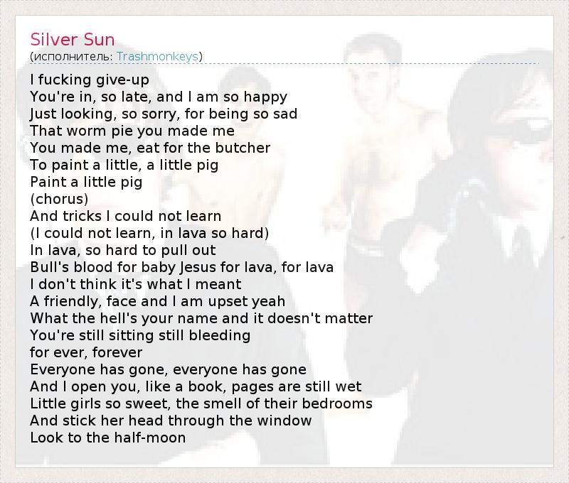 I fucking give-up You're in, so late, and I am so happy Just looking, so sorry, for being so sad That worm pie you made me You made me, eat for the butcher To paint a little, a little pig Paint a little pig (chorus) And tricks I could not learn (I could not learn, in lava so hard) In lava, so hard to pull out Bull's blood for baby Jesus for lava, for lava I don't think it's what I meant A friendly, face and I am upset yeah What the hell's your name and it doesn't matter You're still sitting still bleeding for ever, forever Everyone has gone, everyone has gone And I open you, like a book, pages are still wet Little girls so sweet, the smell of their bedrooms And stick her head through the window Look to the half-moon