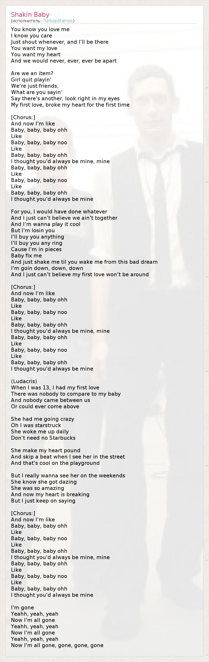 Ты знаешь, что любишь меня, Я знаю, ты неравнодушна. Просто крикни в любой момент, и я приду. Ты хочешь моей любви, Ты хочешь моё сердце, И мы никогда, никогда, никогда не расстанемся... Мы – пара? Девчонка, прекрати играть, Мы не больше, чем друзья. Что ты говоришь? Скажи, что есть другой, глядя мне в глаза, Моя первая любовь разбила моё сердце в первый раз... [Припев:] И теперь я такой: Малышка, малышка, малышка, ооо... Словно Малышка, малышка, малышка, неет, Словно Малышка, малышка, малышка, ооо... Я думал, ты всегда будешь моей, моей, Малышка, малышка, малышка, ооо... Словно Малышка, малышка, малышка, неет, Словно Малышка, малышка, малышка, ооо... Я думал, ты всегда будешь моей... Ради тебя я бы сделал что угодно, Я просто не могу поверить, что мы не вместе. Я хочу изобразить спокойствие, Но я теряю тебя. Я куплю тебе что угодно, Я куплю тебе любое кольцо, Потому что я разбит, Детка, собери меня! Просто встряхни меня, пока я не проснусь от этого дурного сна. Мне всё хуже, хуже, хуже, Я просто не могу поверить, что моей первой любви не будет рядом... [Припев:] И теперь я такой: Малышка, малышка, малышка, ооо... Словно Малышка, малышка, малышка, неет, Словно Малышка, малышка, малышка, ооо... Я думал, ты всегда будешь моей, моей, Малышка, малышка, малышка, ооо... Словно Малышка, малышка, малышка, неет, Словно Малышка, малышка, малышка, ооо... Я думал, ты всегда будешь моей... [Ludacris:] Когда мне было 13, я полюбил в первый раз, Никто не мог сравниться с моей малышкой, И никто не вставал между нами, Никому не было так хорошо. Она сводила меня с ума, О, я испытывал перед ней трепет. Она будила меня каждый день, Не нужен был никакой Старбак. Она заставляла моё сердце колотиться, А дыханье срываться, когда я видел её на улице, Классно было на игровой площадке. Но я и правда хочу видеть её на выходных, Она знает, что стала потрясающей, Она была такой великолепной, И сейчас моё сердце разбивается, Но я просто продолжаю повторять... [Припев:] И теперь я такой: Малышка, малышка, малышка, ооо... Словно Малышка, малышка, малышка, неет, Словно Малышка, малышка, малышка, ооо... Я думал, ты всегда будешь моей, моей, Малышка, малышка, малышка, ооо... Словно Малышка, малышка, малышка, неет, Словно Малышка, малышка, малышка, ооо... Я думал, ты всегда будешь моей... Я влюбился, Да, да, да, Втюрился по самое не хочу, Да, да, да, Я влюбился по уши, Да, да, да, Я втюрился, влюбился...