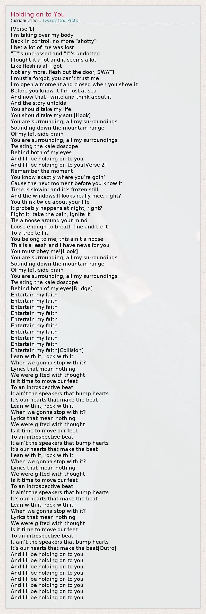 [Verse 1] I'm taking over my body Back in control, no more "shotty" I bet a lot of me was lost "T"'s uncrossed and "I"'s undotted I fought it a lot and it seems a lot Like flesh is all I got Not any more, flesh out the door, SWAT! I must'a forgot, you can't trust me I'm open a moment and closed when you show it Before you know it I'm lost at sea And now that I write and think about it And the story unfolds You should take my life You should take my soul[Hook] You are surrounding, all my surroundings Sounding down the mountain range Of my left-side brain You are surrounding, all my surroundings Twisting the kaleidoscope Behind both of my eyes And I'll be holding on to you And I'll be holding on to you[Verse 2] Remember the moment You know exactly where you're goin' Cause the next moment before you know it Time is slowin' and it's frozen still And the windowsill looks really nice, right? You think twice about your life It probably happens at night, right? Fight it, take the pain, ignite it Tie a noose around your mind Loose enough to breath fine and tie it To a tree tell it You belong to me, this ain't a noose This is a leash and I have news for you You must obey me![Hook] You are surrounding, all my surroundings Sounding down the mountain range Of my left-side brain You are surrounding, all my surroundings Twisting the kaleidoscope Behind both of my eyes[Bridge] Entertain my faith Entertain my faith Entertain my faith Entertain my faith Entertain my faith Entertain my faith Entertain my faith Entertain my faith Entertain my faith Entertain my faith[Collision] Lean with it, rock with it When we gonna stop with it? Lyrics that mean nothing We were gifted with thought Is it time to move our feet To an introspective beat It ain't the speakers that bump hearts It's our hearts that make the beat Lean with it, rock with it When we gonna stop with it? Lyrics that mean nothing We were gifted with thought Is it time to move our feet To an introspective beat It ain't the speakers that bump hearts It's our hearts that make the beat Lean with it, rock with it When we gonna stop with it? Lyrics that mean nothing We were gifted with thought Is it time to move our feet To an introspective beat It ain't the speakers that bump hearts It's our hearts that make the beat Lean with it, rock with it When we gonna stop with it? Lyrics that mean nothing We were gifted with thought Is it time to move our feet To an introspective beat It ain't the speakers that bump hearts It's our hearts that make the beat[Outro] And I'll be holding on to you And I'll be holding on to you And I'll be holding on to you And I'll be holding on to you And I'll be holding on to you And I'll be holding on to you And I'll be holding on to you And I'll be holding on to you
