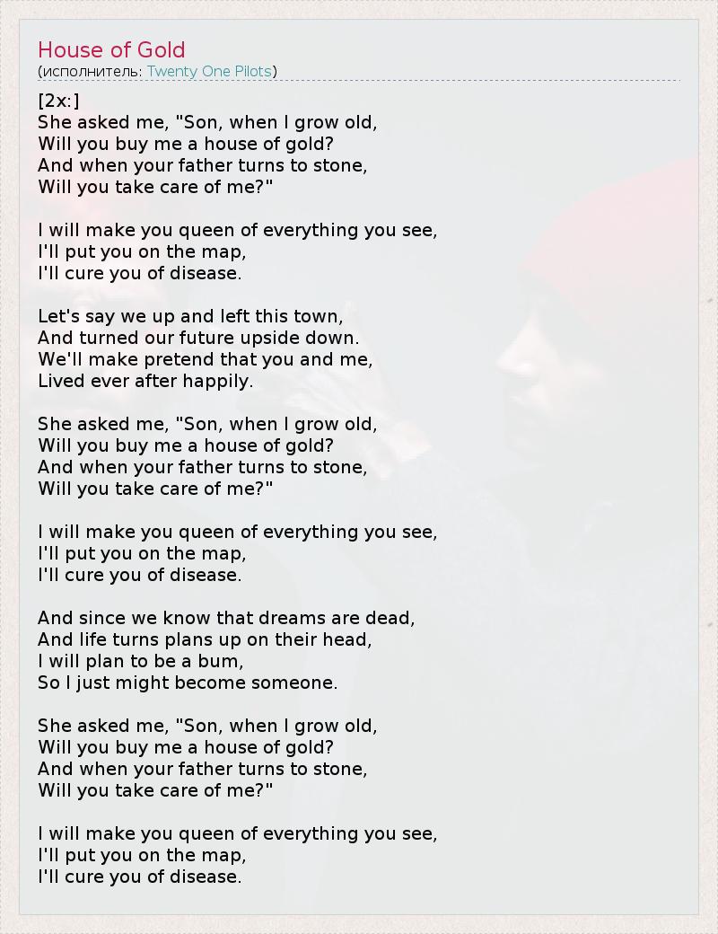 [2x:] She asked me, "Son, when I grow old, Will you buy me a house of gold? And when your father turns to stone, Will you take care of me?" I will make you queen of everything you see, I'll put you on the map, I'll cure you of disease. Let's say we up and left this town, And turned our future upside down. We'll make pretend that you and me, Lived ever after happily. She asked me, "Son, when I grow old, Will you buy me a house of gold? And when your father turns to stone, Will you take care of me?" I will make you queen of everything you see, I'll put you on the map, I'll cure you of disease. And since we know that dreams are dead, And life turns plans up on their head, I will plan to be a bum, So I just might become someone. She asked me, "Son, when I grow old, Will you buy me a house of gold? And when your father turns to stone, Will you take care of me?" I will make you queen of everything you see, I'll put you on the map, I'll cure you of disease.