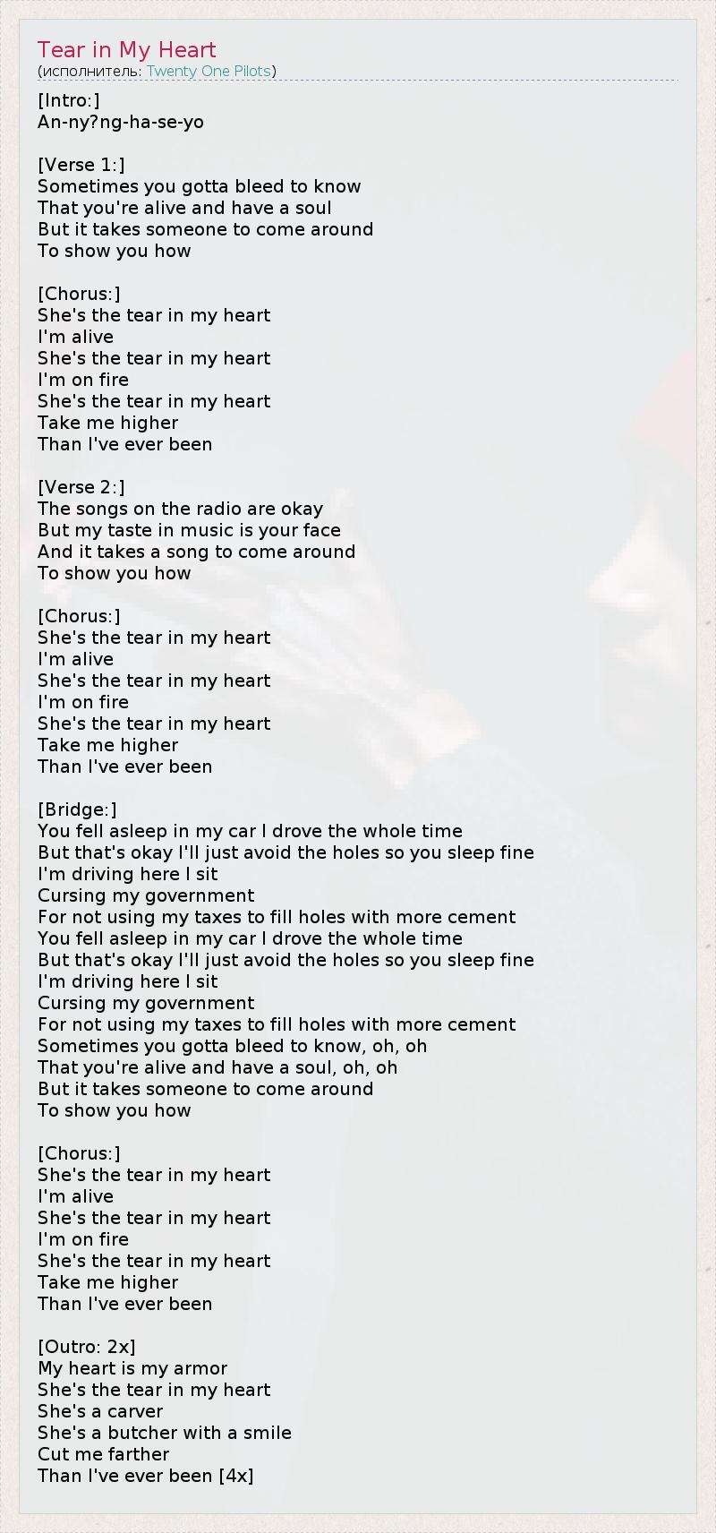 [Intro:] An-ny?ng-ha-se-yo [Verse 1:] Sometimes you gotta bleed to know That you're alive and have a soul But it takes someone to come around To show you how [Chorus:] She's the tear in my heart I'm alive She's the tear in my heart I'm on fire She's the tear in my heart Take me higher Than I've ever been [Verse 2:] The songs on the radio are okay But my taste in music is your face And it takes a song to come around To show you how [Chorus:] She's the tear in my heart I'm alive She's the tear in my heart I'm on fire She's the tear in my heart Take me higher Than I've ever been [Bridge:] You fell asleep in my car I drove the whole time But that's okay I'll just avoid the holes so you sleep fine I'm driving here I sit Cursing my government For not using my taxes to fill holes with more cement You fell asleep in my car I drove the whole time But that's okay I'll just avoid the holes so you sleep fine I'm driving here I sit Cursing my government For not using my taxes to fill holes with more cement Sometimes you gotta bleed to know, oh, oh That you're alive and have a soul, oh, oh But it takes someone to come around To show you how [Chorus:] She's the tear in my heart I'm alive She's the tear in my heart I'm on fire She's the tear in my heart Take me higher Than I've ever been [Outro: 2x] My heart is my armor She's the tear in my heart She's a carver She's a butcher with a smile Cut me farther Than I've ever been [4x]