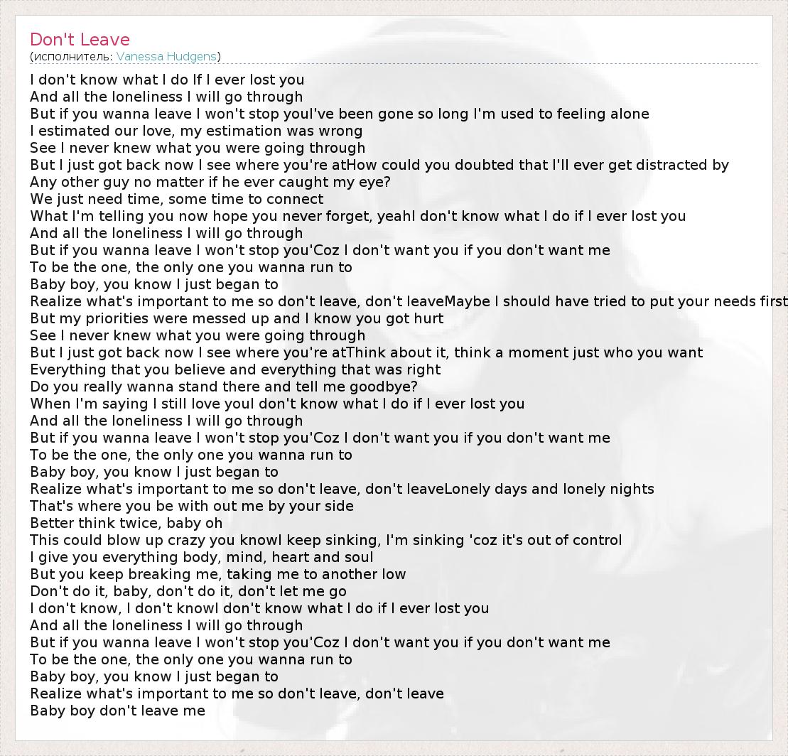 I don't know what I do If I ever lost you And all the loneliness I will go through But if you wanna leave I won't stop youI've been gone so long I'm used to feeling alone I estimated our love, my estimation was wrong See I never knew what you were going through But I just got back now I see where you're atHow could you doubted that I'll ever get distracted by Any other guy no matter if he ever caught my eye? We just need time, some time to connect What I'm telling you now hope you never forget, yeahI don't know what I do if I ever lost you And all the loneliness I will go through But if you wanna leave I won't stop you'Coz I don't want you if you don't want me To be the one, the only one you wanna run to Baby boy, you know I just began to Realize what's important to me so don't leave, don't leaveMaybe I should have tried to put your needs first But my priorities were messed up and I know you got hurt See I never knew what you were going through But I just got back now I see where you're atThink about it, think a moment just who you want Everything that you believe and everything that was right Do you really wanna stand there and tell me goodbye? When I'm saying I still love youI don't know what I do if I ever lost you And all the loneliness I will go through But if you wanna leave I won't stop you'Coz I don't want you if you don't want me To be the one, the only one you wanna run to Baby boy, you know I just began to Realize what's important to me so don't leave, don't leaveLonely days and lonely nights That's where you be with out me by your side Better think twice, baby oh This could blow up crazy you knowI keep sinking, I'm sinking 'coz it's out of control I give you everything body, mind, heart and soul But you keep breaking me, taking me to another low Don't do it, baby, don't do it, don't let me go I don't know, I don't knowI don't know what I do if I ever lost you And all the loneliness I will go through But if you wanna leave I won't stop you'Coz I don't want you if you don't want me To be the one, the only one you wanna run to Baby boy, you know I just began to Realize what's important to me so don't leave, don't leave Baby boy don't leave me