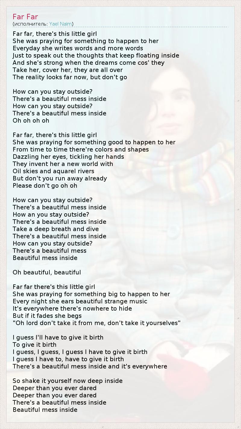 Far far, there's this little girl She was praying for something to happen to her Everyday she writes words and more words Just to speak out the thoughts that keep floating inside And she's strong when the dreams come cos' they Take her, cover her, they are all over The reality looks far now, but don't go How can you stay outside? There's a beautiful mess inside How can you stay outside? There's a beautiful mess inside Oh oh oh oh Far far, there's this little girl She was praying for something good to happen to her From time to time there're colors and shapes Dazzling her eyes, tickling her hands They invent her a new world with Oil skies and aquarel rivers But don't you run away already Please don't go oh oh How can you stay outside? There's a beautiful mess inside How an you stay outside? There's a beautiful mess inside Take a deep breath and dive There's a beautiful mess inside How can you stay outside? There's a beautiful mess Beautiful mess inside Oh beautiful, beautiful Far far there's this little girl She was praying for something big to happen to her Every night she ears beautiful strange music It's everywhere there's nowhere to hide But if it fades she begs "Oh lord don't take it from me, don't take it yourselves" I guess I'll have to give it birth To give it birth I guess, I guess, I guess I have to give it birth I guess I have to, have to give it birth There's a beautiful mess inside and it's everywhere So shake it yourself now deep inside Deeper than you ever dared Deeper than you ever dared There's a beautiful mess inside Beautiful mess inside