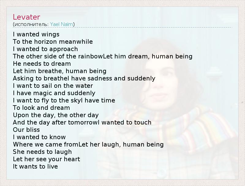 I wanted wings To the horizon meanwhile I wanted to approach The other side of the rainbowLet him dream, human being He needs to dream Let him breathe, human being Asking to breatheI have sadness and suddenly I want to sail on the water I have magic and suddenly I want to fly to the skyI have time To look and dream Upon the day, the other day And the day after tomorrowI wanted to touch Our bliss I wanted to know Where we came fromLet her laugh, human being She needs to laugh Let her see your heart It wants to live