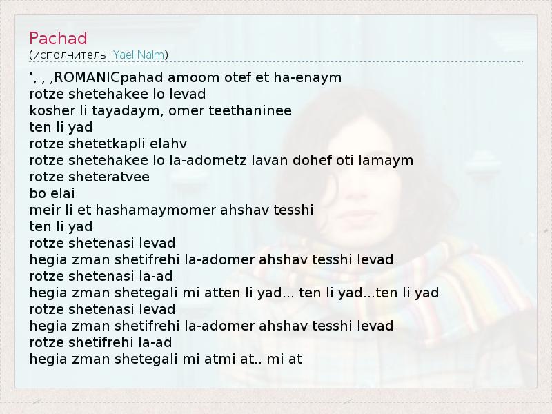', , ,ROMANICpahad amoom otef et ha-enaym rotze shetehakee lo levad kosher li tayadaym, omer teethaninee ten li yad rotze shetetkapli elahv rotze shetehakee lo la-adometz lavan dohef oti lamaym rotze sheteratvee bo elai meir li et hashamaymomer ahshav tesshi ten li yad rotze shetenasi levad hegia zman shetifrehi la-adomer ahshav tesshi levad rotze shetenasi la-ad hegia zman shetegali mi atten li yad... ten li yad...ten li yad rotze shetenasi levad hegia zman shetifrehi la-adomer ahshav tesshi levad rotze shetifrehi la-ad hegia zman shetegali mi atmi at.. mi at