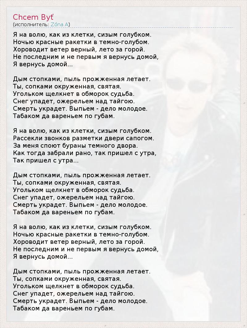 Я на волю, как из клетки, сизым голубком. Ночью красные ракетки в темно-голубом. Хороводит ветер верный, лето за горой. Не последним и не первым я вернусь домой, Я вернусь домой... Дым стопками, пыль прожженная летает. Ты, сопками окруженная, святая. Угольком щелкнет в обморок судьба. Снег упадет, ожерельем над тайгою. Смерть украдет. Выпьем - дело молодое. Табаком да вареньем по губам. Я на волю, как из клетки, сизым голубком. Рассекли звонков разметки двери сапогом. За меня споют бураны темного двора. Как тогда забрали рано, так пришел с утра, Так пришел с утра... Дым стопками, пыль прожженная летает. Ты, сопками окруженная, святая. Угольком щелкнет в обморок судьба. Снег упадет, ожерельем над тайгою. Смерть украдет. Выпьем - дело молодое. Табаком да вареньем по губам. Я на волю, как из клетки, сизым голубком. Ночью красные ракетки в темно-голубом. Хороводит ветер верный, лето за горой. Не последним и не первым я вернусь домой, Я вернусь домой... Дым стопками, пыль прожженная летает. Ты, сопками окруженная, святая. Угольком щелкнет в обморок судьба. Снег упадет, ожерельем над тайгою. Смерть украдет. Выпьем - дело молодое. Табаком да вареньем по губам.