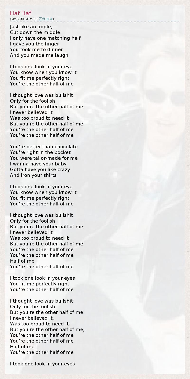 Just like an apple, Cut down the middle I only have one matching half I gave you the finger You took me to dinner And you made me laugh I took one look in your eye You know when you know it You fit me perfectly right You're the other half of me I thought love was bullshit Only for the foolish But you're the other half of me I never believed it Was too proud to need it But you're the other half of me You're the other half of me You're the other half of me You're better than chocolate You're right in the pocket You were tailor-made for me I wanna have your baby Gotta have you like crazy And iron your shirts I took one look in your eye You know when you know it You fit me perfectly right You're the other half of me I thought love was bullshit Only for the foolish But you're the other half of me I never believed it Was too proud to need it But you're the other half of me You're the other half of me You're the other half of me Half of me You're the other half of me I took one look in your eyes You fit me perfectly right You're the other half of me I thought love was bullshit Only for the foolish But you're the other half of me I never believed it, Was too proud to need it But you're the other half of me, You're the other half of me You're the other half of me Half of me You're the other half of me I took one look in your eyes