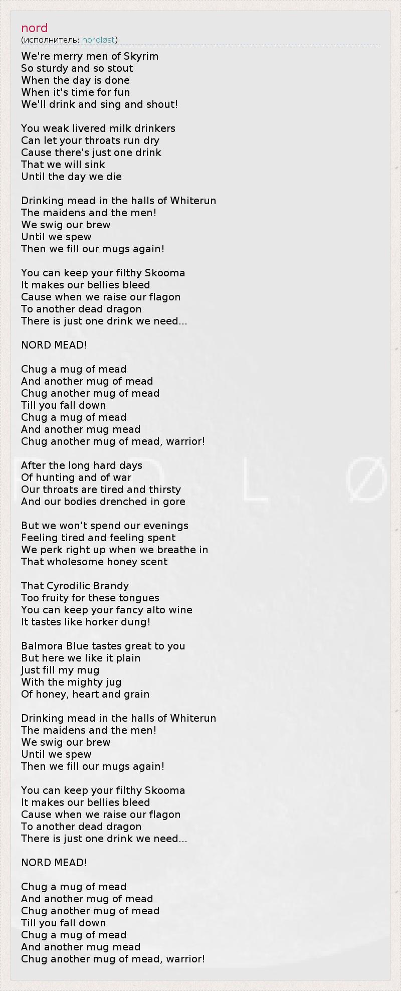 Мы норды из Скайрима, Здоровы и крепки, Как вечер настал, Мы заполняем зал, Поем и пьем, орем! На что нам ваше пиво? Зачем нам сухость в нем? Есть лишь один напиток, Что пить мы будем лихо Всю жизнь, день за днем! Пьют мед в вайтранских залах Девицы и воины, Пока не блеванем Его мы пить будем, И набьем вновь животы! Не предлагай нам Скумы, А то тебе конец придет! Когда поднимем фляги Мы, разлегшись на привале, Одна мысль в голове оживет... ПЕЙ МЕД! Хряпни кружку меда, А затем еще немного, А затем еще немного, Пока ты не упал! Хряпни кружку меда, А затем еще немного, А затем еще немного, И ты воином стал! И, после дней лишений, Охоты и войны, Просохли наши глотки, В кровь окрасились клинки. Но мы не пали духом, Прогнали унынья яд, Лишь только мы учуяли Медовый аромат. Твой Сиродильский бренди Поперек нам горла встал, И держи при себе свое красное вино, Оно на вкус как волчий кал! Хоть и есть другие напитки, Они нам не по нутру! Ты наполни мою флягу, Медом, что завет нас в драку, И я тебе эту песнь спою! Пьют мед в вайтранских залах Девицы и воины, Пока не блеванем Его мы пить будем, И набьем вновь животы! Не предлагай нам Скумы, А то тебе конец придет! Когда поднимем фляги Мы, разлегшись на привале, Одна мысль в голове оживет... ПЕЙ МЕД! Хряпни кружку меда, А затем еще немного, А затем еще немного, Пока ты не упал! Хряпни кружку меда, А затем еще немного, А затем еще немного, И ты воином стал!