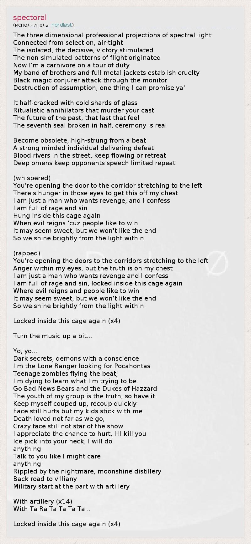 Трехмерные профессиональные проектирования спектрального света Изолированные, решающие, стимулирующие победу Не модулированные образцы свершились Теперь я плотоядное животное в обязательном туре Мои братья в металлических жилетах проявляют жестокость Фокусник черной магии нападает через монитор Разрушение всех предположений, это все что я могу обещать я я я я я Это половинки сломанного с холодными черепками стекла Ритуальные обряды, которые убивают ваш склад ума Будущее в прошлом, последнее чувство Клеймо разбитое напополам, реальная церемония Станем атрофированными, чувствительными от удара Сильный индивидуум, признающий поражение Реки крови на улицах, продолжают течь или отступают Глубокие предзнаменования ограничивают повторением речи противников (Шёпотом) Откройте дверь в коридор, ведущий налево Голод в твоих глазах, крик моей души Я лишь хочу мести, и я признаюсь Я полон гневом и грехом Я подвешен внутри этой клетки Зло господствует, любят побеждать И это кажется приятным, но мы не любим конец Так что мы сияем ярко от света в своих пределах Рэп Откройте дверь в коридор, ведущий налево Голод в твоих глазах, крик моей души Я лишь хочу мести, и я признаюсь Я полон гневом и грехом Я подвешен внутри этой клетки Зло господствует, любят побеждать И это кажется приятным, но мы не любим конец Так что мы сияем ярко от света в своих пределах Заперты внутри этой клетки (*4р) Измените музыку немного…. Ёо ёо ёо Темные тайны, демоны с совестью Я – Одинокий смотритель похожий на Покахонтосов Зомбированные подростки бездельники Я умираю, чтобы узнать кем я пробую быть Идите «Бэд ньюз беаз» и «зэ дьюкс оф хазардз» В моей группе все молодые и это правда Удачи мне, помогите мне На лице моем отражается резкая критика Смерть любят далеко не все Сумасшедшее лицо, не звезда показа Я оцениваю шансы, я убью тебя Топориком для льда по твоей шее, я это сделаю Что-нибудь сделаю разговаривая с тобой, я мог бы позаботиться о чем-либо Легким кошмаром, лунным светом Найти бы дорогу обратно Война начинается с артиллерии С артиллерии (*14р.) Та ра та та та тара та та та