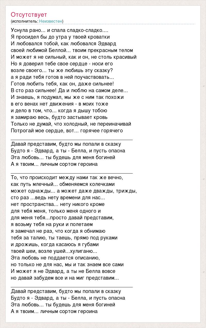 Уснула рано... и спала сладко-сладко.... Я просидел бы до утра у твоей кроватки И любовался тобой, как любовался Эдвард своей любимой Беллой... твоим прекрасным телом И может я не сильный, как и он, не столь красивый Но я доверил тебе свое сердце - носи его возле своего... ты же любишь эту сказку? а я ради тебя готов в ней поучаствовать... Готов любить тебя, как он, даже сильнее! В сто раз сильнее! Да и люблю на самом деле... И знаешь, я подумал, мы же с ним так похожи в его венах нет движения - в моих тоже и дело в том, что... когда я дышу тобою я замираю весь, будто застывает кровь Только не думай, что холодный, не переиначивай Потрогай мое сердце, вот... горячее горячего ___________________________________________ Давай представим, будто мы попали в сказку Будто я - Эдвард, а ты - Белла, и пусть опасна Эта любовь... ты будешь для меня богиней А я твоим... личным сортом героина ___________________________________________ То, что происходит между нами так же вечно, как путь млечный... обменяемся колечками может однажды... а может даже дважды, трижды, сто раз ...ведь нету времени для нас... нет пространства... нету никого кроме для тебя меня, только меня одного и для меня тебя...просто давай представим, я возьму тебя на руки и полетаем я замечал не раз, что когда я обнимаю тебя за талию, ты таешь, прямо под руками и дрожишь, когда касаюсь я губами твоей шеи, возле ушей...хулиганю... Эта любовь не поддается описанию, но только не для нас, мы и так знаем все сами И может я не Эдвард, а ты не Белла вовсе но давай забудем все и на миг представим... ___________________________________________ Давай представим, будто мы попали в сказку Будто я - Эдвард, а ты - Белла, и пусть опасна Эта любовь... ты будешь для меня богиней А я твоим... личным сортом героина