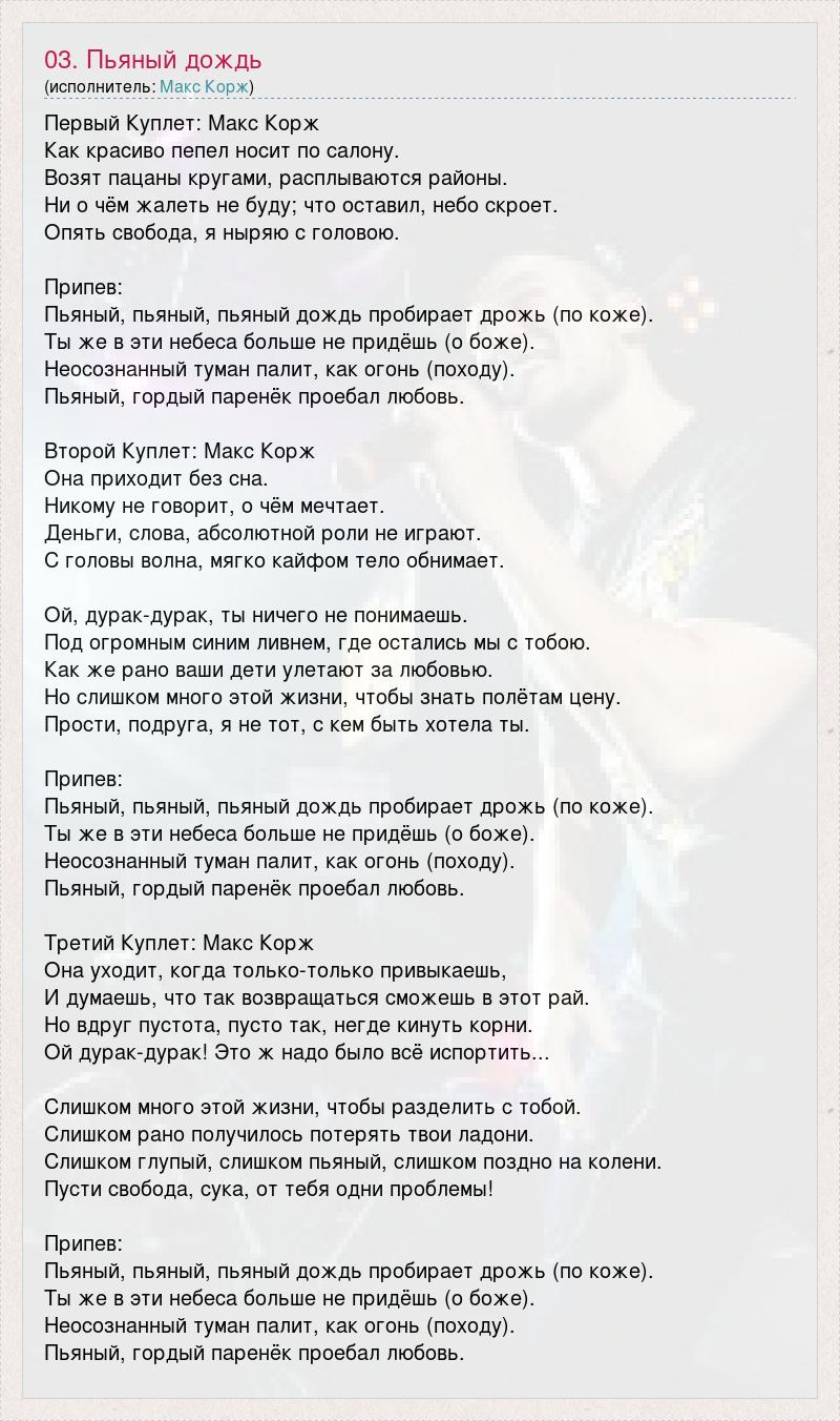 Первый Куплет: Макс Корж Как красиво пепел носит по салону. Возят пацаны кругами, расплываются районы. Ни о чём жалеть не буду; что оставил, небо скроет. Опять свобода, я ныряю с головою. Припев: Пьяный, пьяный, пьяный дождь пробирает дрожь (по коже). Ты же в эти небеса больше не придёшь (о боже). Неосознанный туман палит, как огонь (походу). Пьяный, гордый паренёк проебал любовь. Второй Куплет: Макс Корж Она приходит без сна. Никому не говорит, о чём мечтает. Деньги, слова, абсолютной роли не играют. С головы волна, мягко кайфом тело обнимает. Ой, дурак-дурак, ты ничего не понимаешь. Под огромным синим ливнем, где остались мы с тобою. Как же рано ваши дети улетают за любовью. Но слишком много этой жизни, чтобы знать полётам цену. Прости, подруга, я не тот, с кем быть хотела ты. Припев: Пьяный, пьяный, пьяный дождь пробирает дрожь (по коже). Ты же в эти небеса больше не придёшь (о боже). Неосознанный туман палит, как огонь (походу). Пьяный, гордый паренёк проебал любовь. Третий Куплет: Макс Корж Она уходит, когда только-только привыкаешь, И думаешь, что так возвращаться сможешь в этот рай. Но вдруг пустота, пусто так, негде кинуть корни. Ой дурак-дурак! Это ж надо было всё испортить... Слишком много этой жизни, чтобы разделить с тобой. Слишком рано получилось потерять твои ладони. Слишком глупый, слишком пьяный, слишком поздно на колени. Пусти свобода, сука, от тебя одни проблемы! Припев: Пьяный, пьяный, пьяный дождь пробирает дрожь (по коже). Ты же в эти небеса больше не придёшь (о боже). Неосознанный туман палит, как огонь (походу). Пьяный, гордый паренёк проебал любовь.