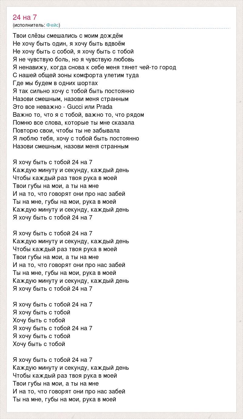 Твои слёзы смешались с моим дождём Не хочу быть один, я хочу быть вдвоём Не хочу быть с собой, я хочу быть с тобой Я не чувствую боль, но я чувствую любовь Я ненавижу, когда снова к себе меня тянет чей-то город С нашей общей зоны комфорта улетим туда Где мы будем в одних шортах Я так сильно хочу с тобой быть постоянно Назови смешным, назови меня странным Это все неважно - Gucci или Prada Важно то, что я с тобой, важно то, что рядом Помню все слова, которые ты мне сказала Повторю свои, чтобы ты не забывала Я люблю тебя, хочу с тобой быть постоянно Назови смешным, назови меня странным Я хочу быть с тобой 24 на 7 Каждую минуту и секунду, каждый день Чтобы каждый раз твоя рука в моей Твои губы на мои, а ты на мне И на то, что говорят они про нас забей Ты на мне, губы на мои, рука в моей Каждую минуту и секунду, каждый день Я хочу быть с тобой 24 на 7 Я хочу быть с тобой 24 на 7 Каждую минуту и секунду, каждый день Чтобы каждый раз твоя рука в моей Твои губы на мои, а ты на мне И на то, что говорят они про нас забей Ты на мне, губы на мои, рука в моей Каждую минуту и секунду, каждый день Я хочу быть с тобой 24 на 7 Я хочу быть с тобой 24 на 7 Я хочу быть с тобой Хочу быть с тобой Я хочу быть с тобой 24 на 7 Я хочу быть с тобой Хочу быть с тобой Я хочу быть с тобой 24 на 7 Каждую минуту и секунду, каждый день Чтобы каждый раз твоя рука в моей Твои губы на мои, а ты на мне И на то, что говорят они про нас забей Ты на мне, губы на мои, рука в моей