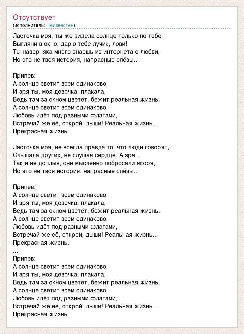 Ласточка моя, ты же видела солнце только по тебе Выгляни в окно, дарю тебе лучик, лови! Ты наверняка много знаешь из интернета о любви, Но это не твоя история, напрасные слёзы.. Припев: А солнце светит всем одинаково, И зря ты, моя девочка, плакала, Ведь там за окном цветёт, бежит реальная жизнь. А солнце светит всем одинаково, Любовь идёт под разными флагами, Встречай же её, открой, дыши! Реальная жизнь... Прекрасная жизнь. Ласточка моя, не всегда правда то, что люди говорят, Слышала других, не слушая сердце. А зря... Так и не доплыв, они мысленно побросали якоря, Но это не твоя история, напрасные слёзы.. Припев: А солнце светит всем одинаково, И зря ты, моя девочка, плакала, Ведь там за окном цветёт, бежит реальная жизнь. А солнце светит всем одинаково, Любовь идёт под разными флагами, Встречай же её, открой, дыши! Реальная жизнь... Прекрасная жизнь. ... Припев: А солнце светит всем одинаково, И зря ты, моя девочка, плакала, Ведь там за окном цветёт, бежит реальная жизнь. А солнце светит всем одинаково, Любовь идёт под разными флагами, Встречай же её, открой, дыши! Реальная жизнь... Прекрасная жизнь.